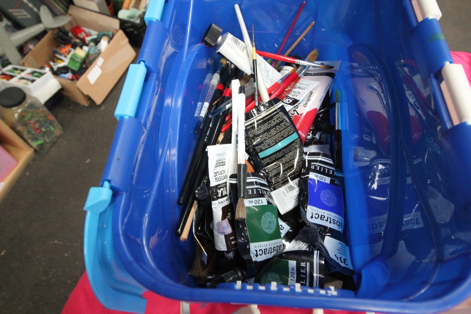 box of mixed art contents inc Abstract acrylic paints, Daler Rowney acrylic paints, many paint, brushes etc