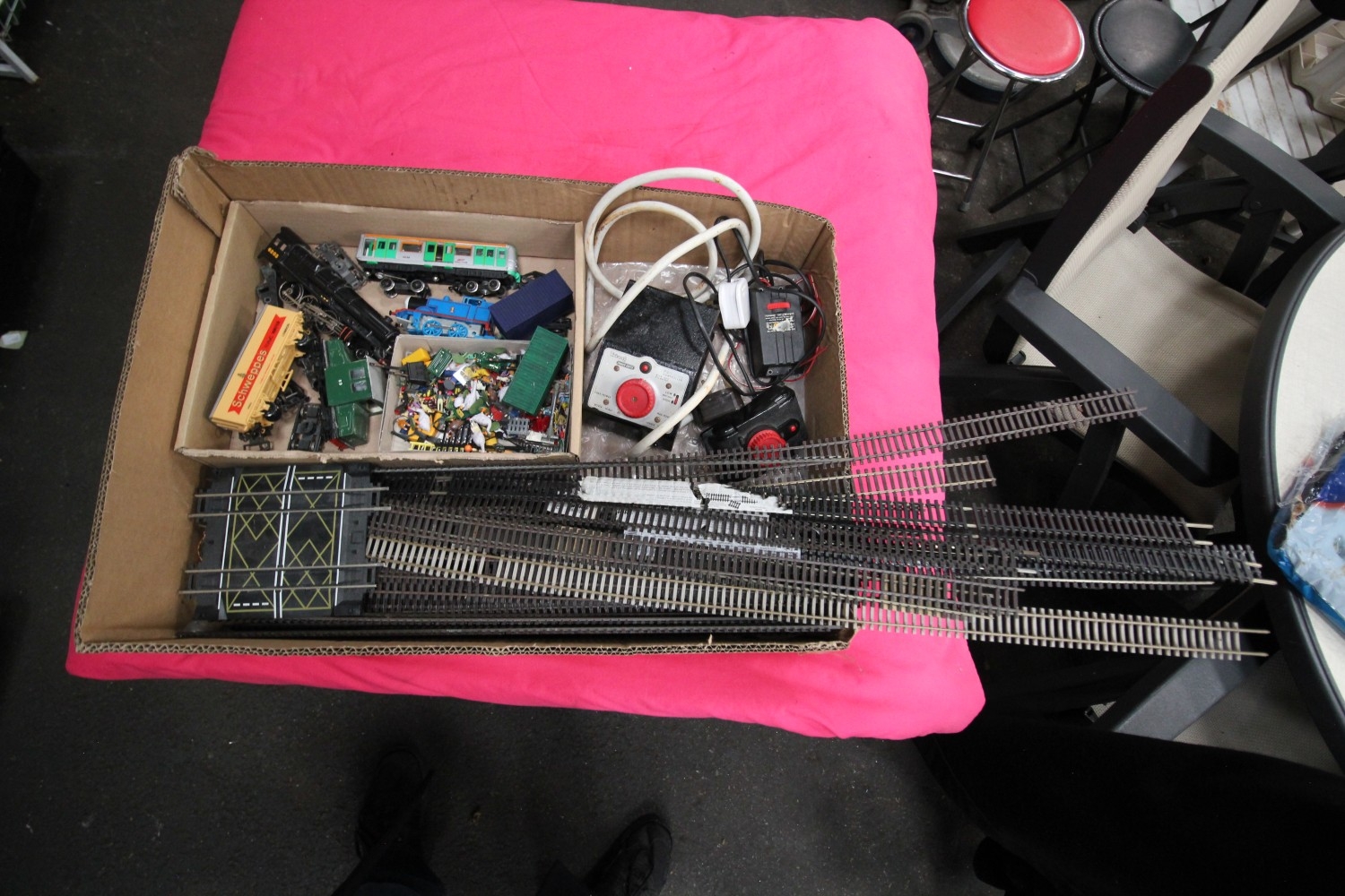 hornby and peco 00 gauge track, figures, engine and controllers