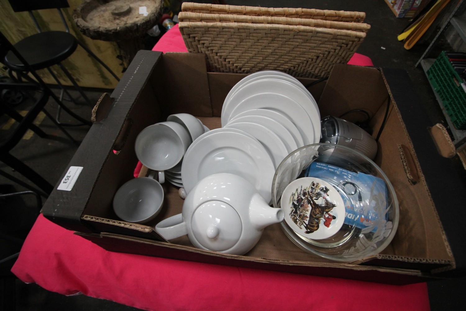selection of habitat plates, cups, teacup, wicker placemats and more