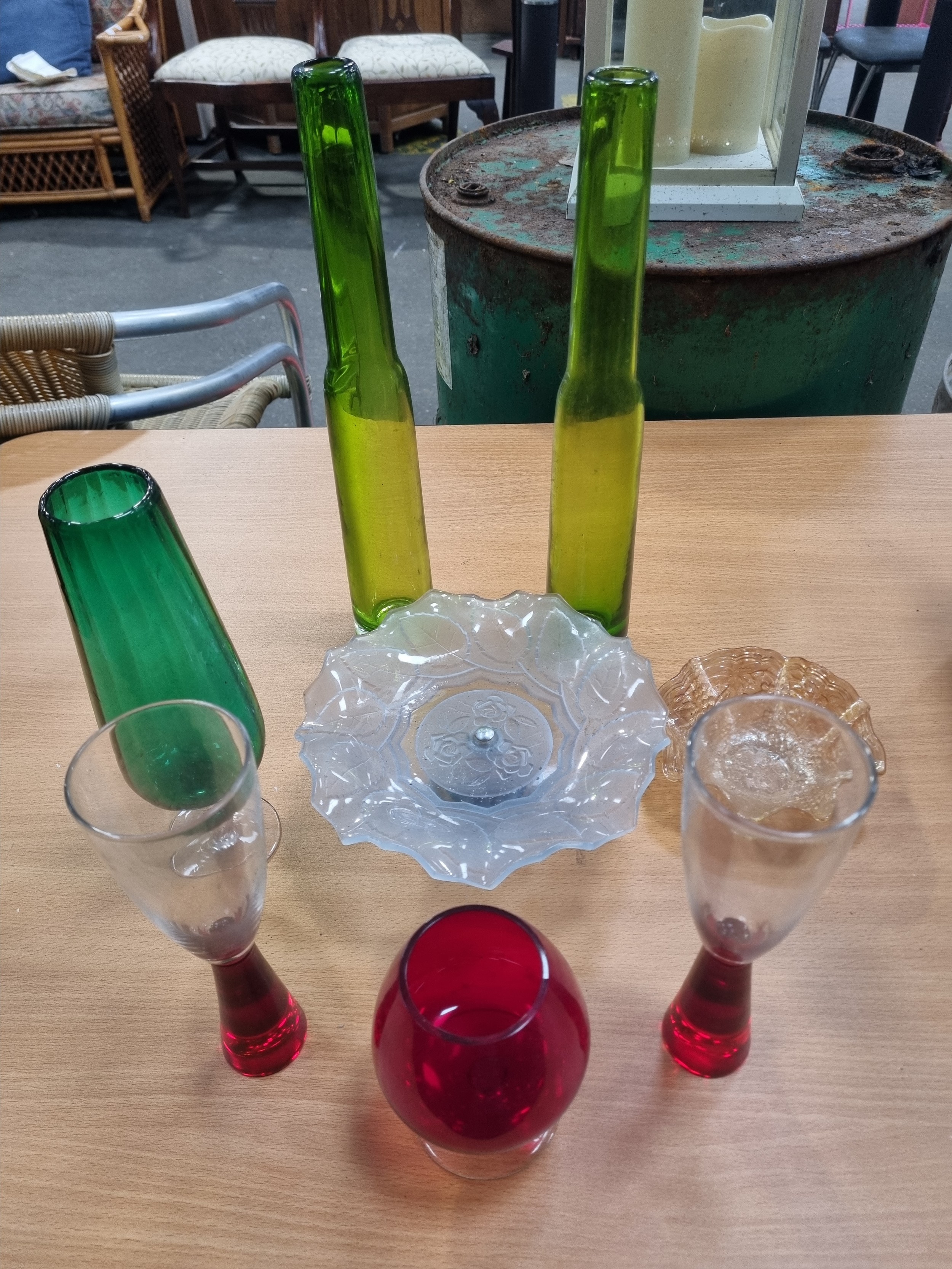 selection of mixed glassware inc ruffled carnival glass dish, Artland Prescott Ruby Red Solid Footed Wine Glass, two matching Clipper olive glass vases and more