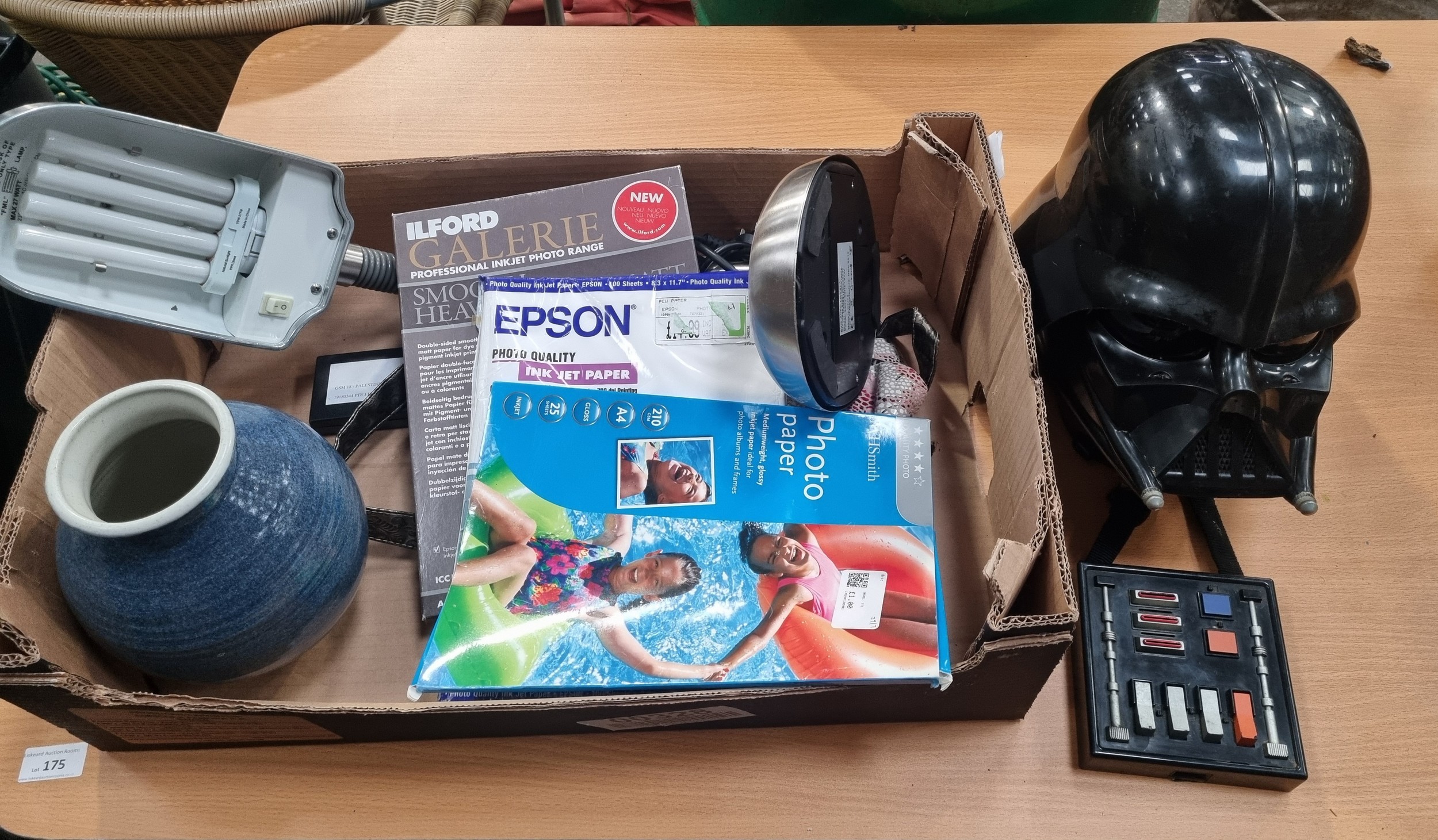 box of misc inc, printer photo paper, working darth vader helmet, poseable lamp etc