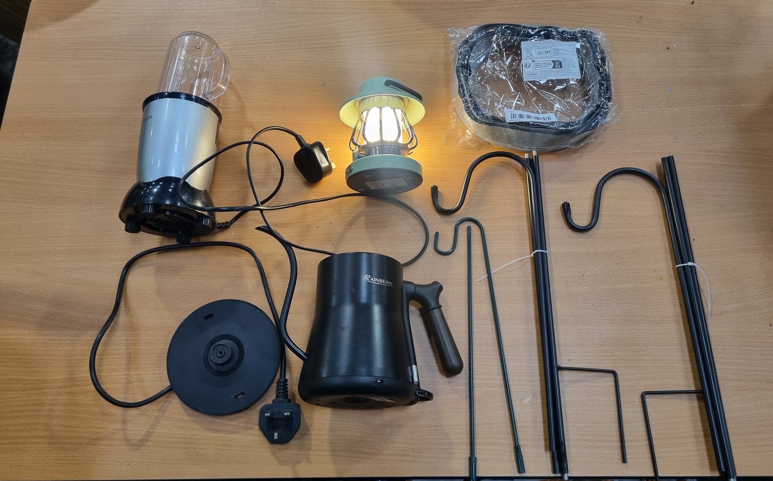 selection of camping gear such as usb charged lamp, blender, low voltage kettle, brand new hook lantern holders and more