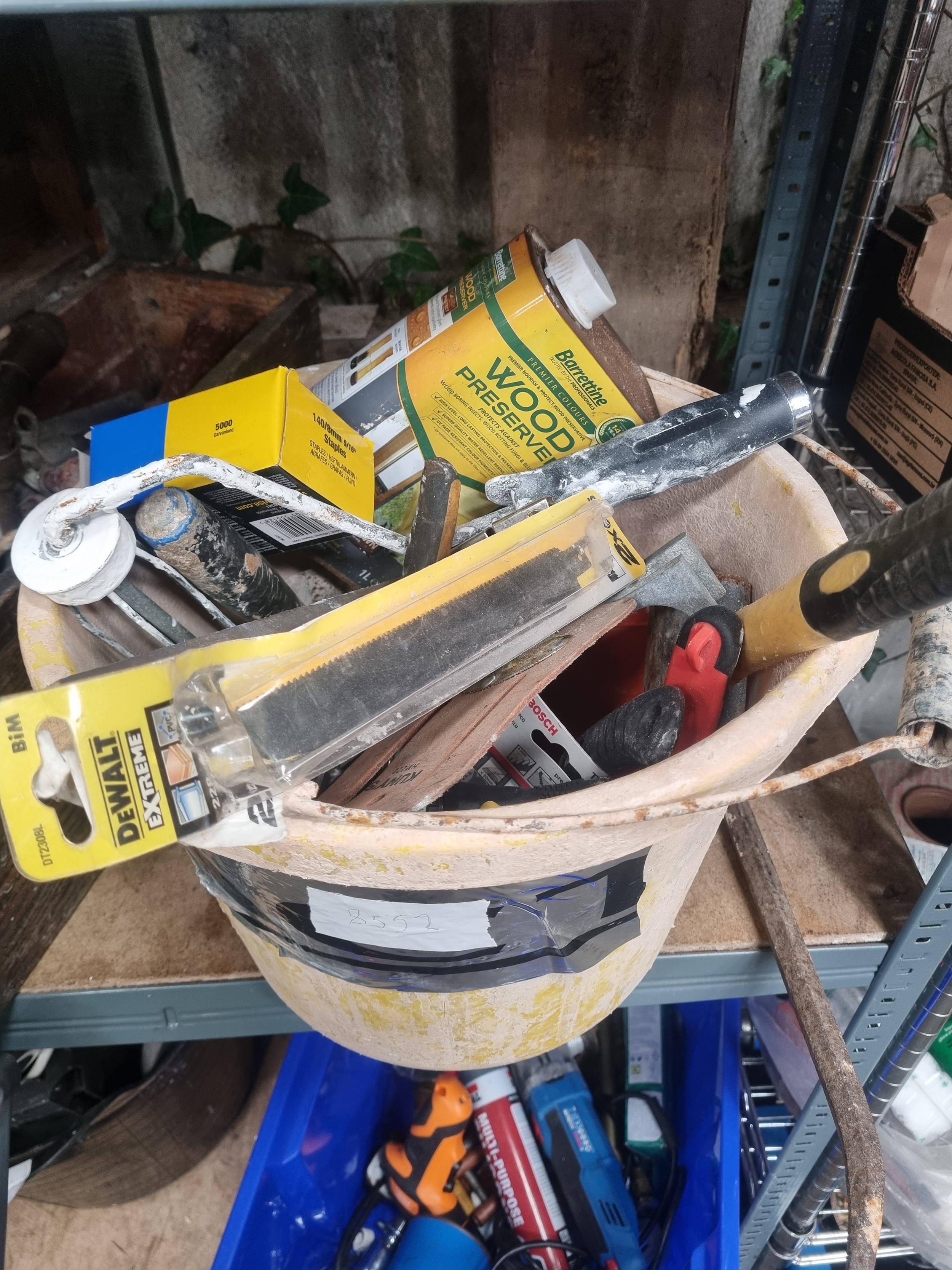 Builder’s bucket of tools inc lump hammer, lead beater, gauging trowel, hammer loop, staples, tin snips, crowbar, tap spanner, pipe cutters and more