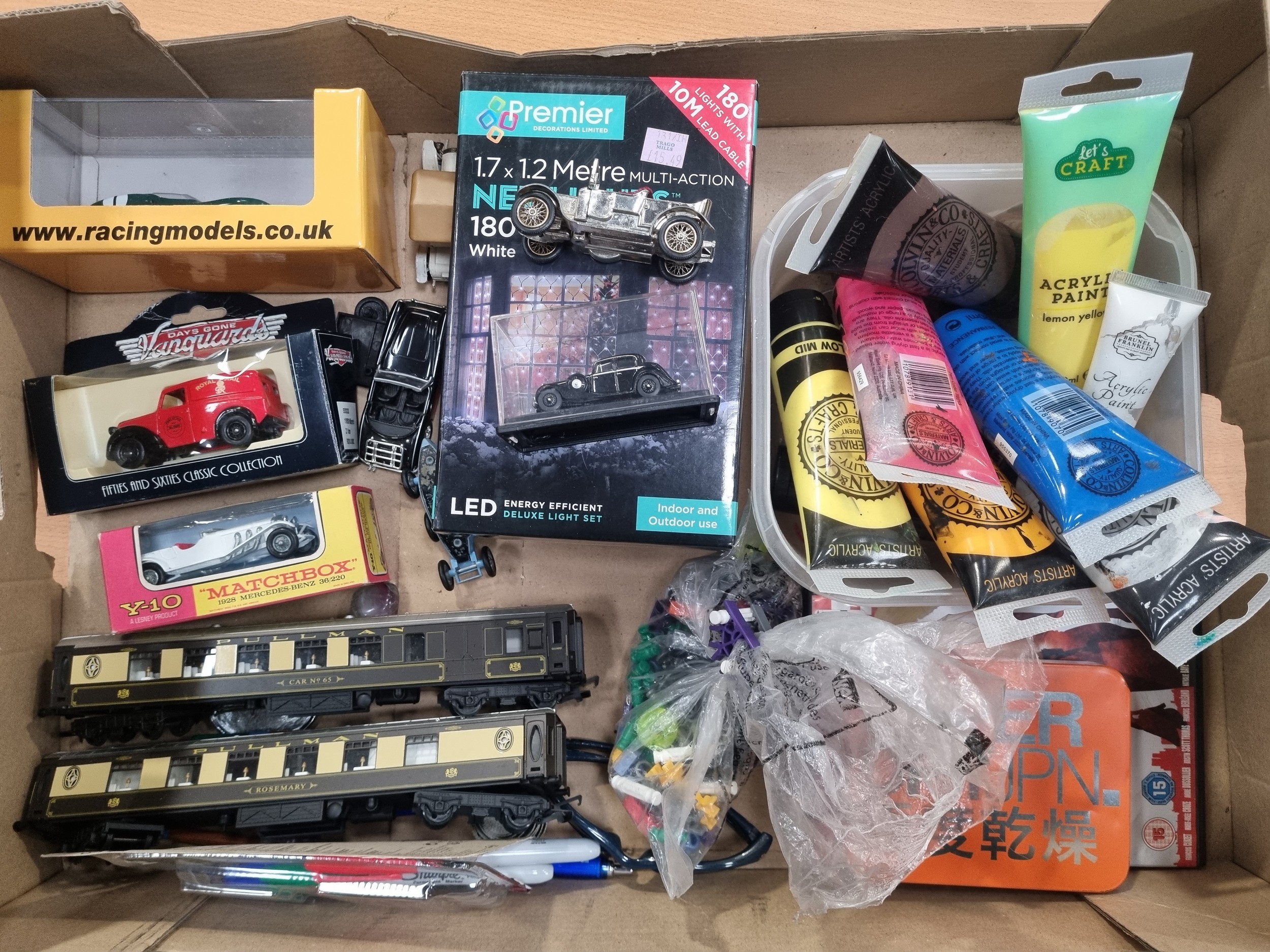 large assorted box of arts and crafts plus vintage cars and trains including Lesney, Matchbox, Days Gone, Hornby, vintage Great Western Railway Co. badge and more
