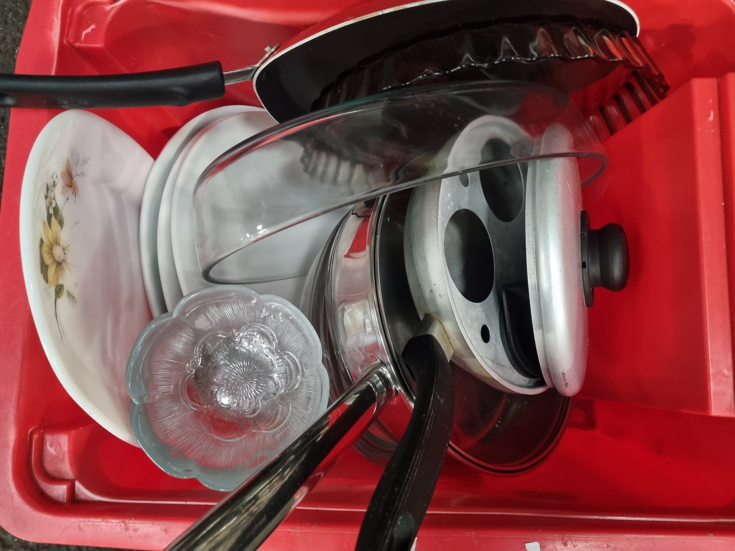 Large tub of kitchenalia inc. Pyrex dishes, dessert bowls, stainless steel frying pan, vintage aluminium egg poaching pan, flan dish and more