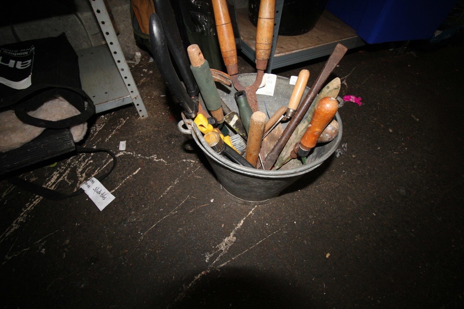 Lot 46: Vintage galvanised bucket and contents inc. gardening trowel,...