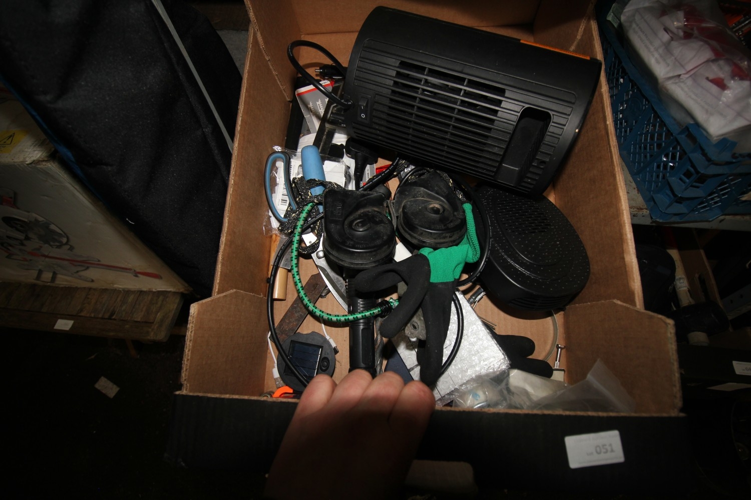 Mixed box of hardware inc Govee Life app controlled ceramic heater, electrician’s screwdriver, heavy-duty meat cutting scissors, 12v car cigarette socket plugin heater, stanley chise, jigsaw blades, pincers, utility knife blades etc.