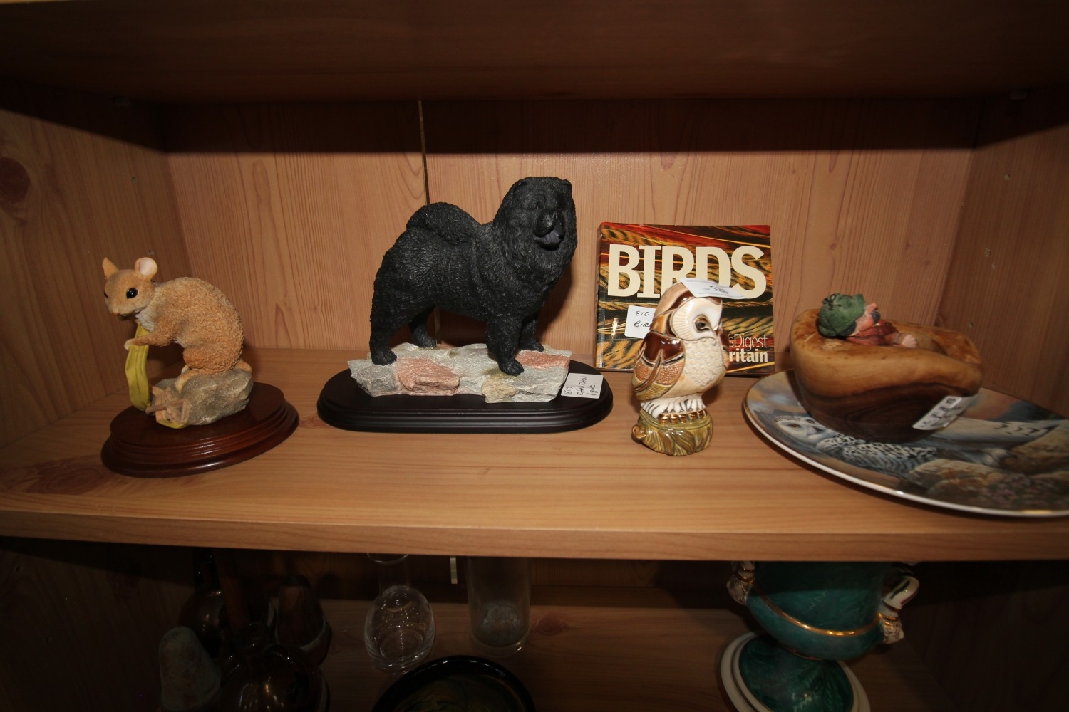 shelf full of items inc chowchow by nature craft, ceramic rose owl, hardwood bowl with huntsman model, field mouse model and more