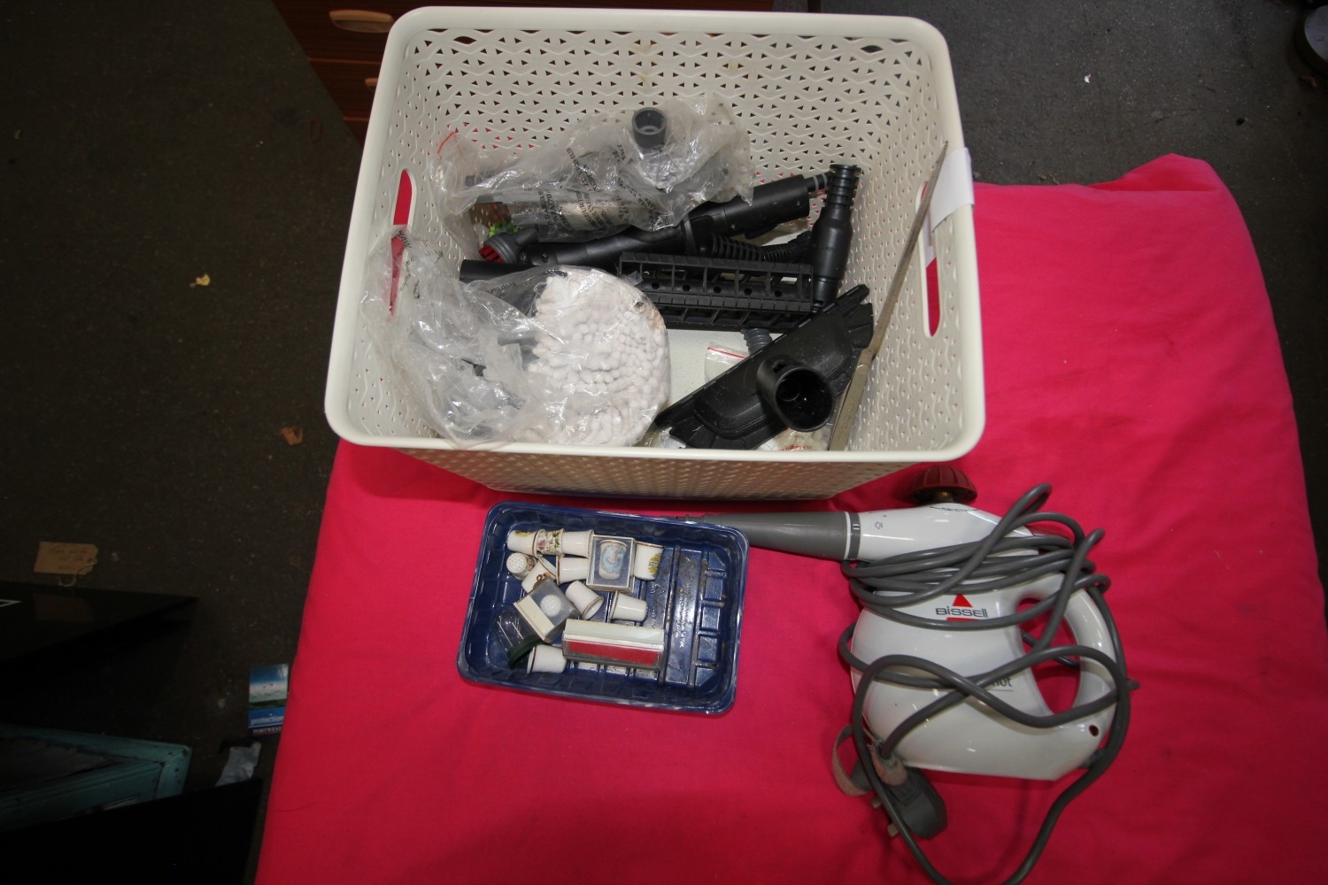 basket of items such as bissell steamer, thimbles and more