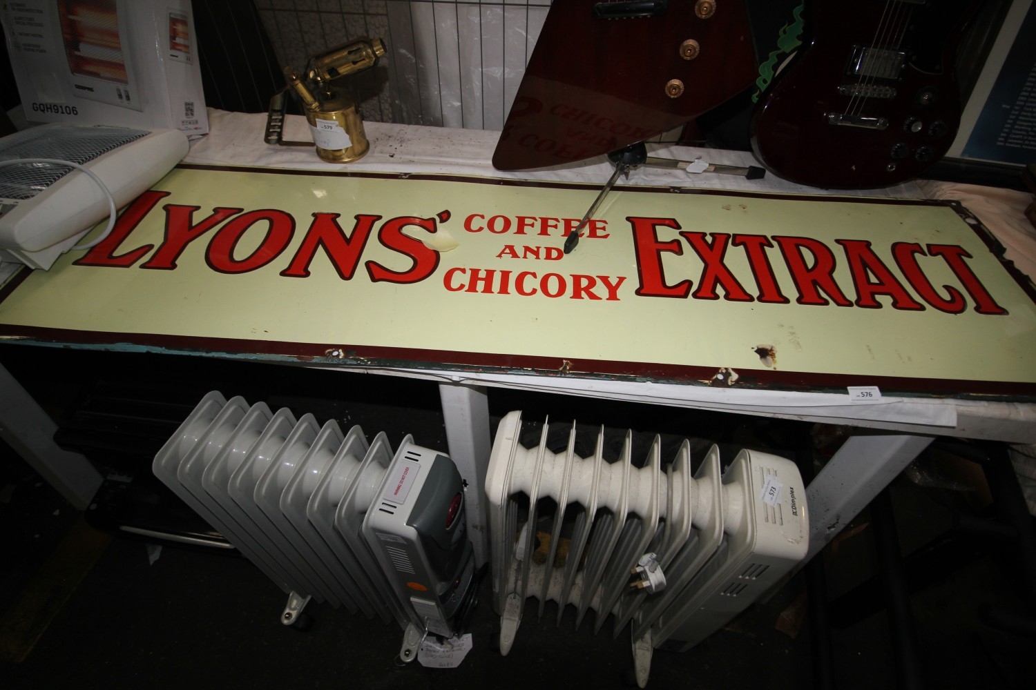 vintage enamel lyons coffee and chicory extract sign measuring 59" x 18"