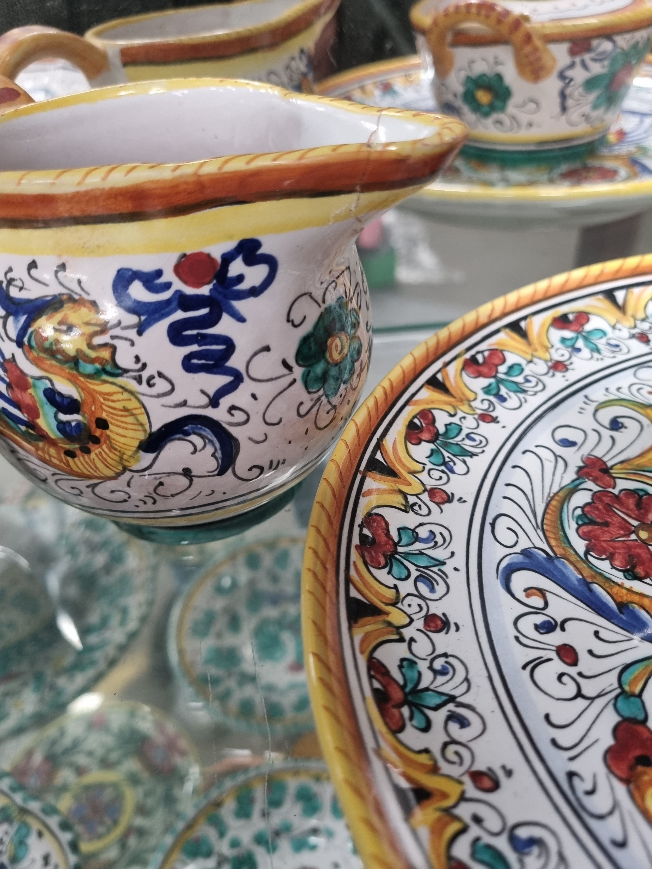 collection of Italian deruta ceramics with the traditional raffaellesco pattern