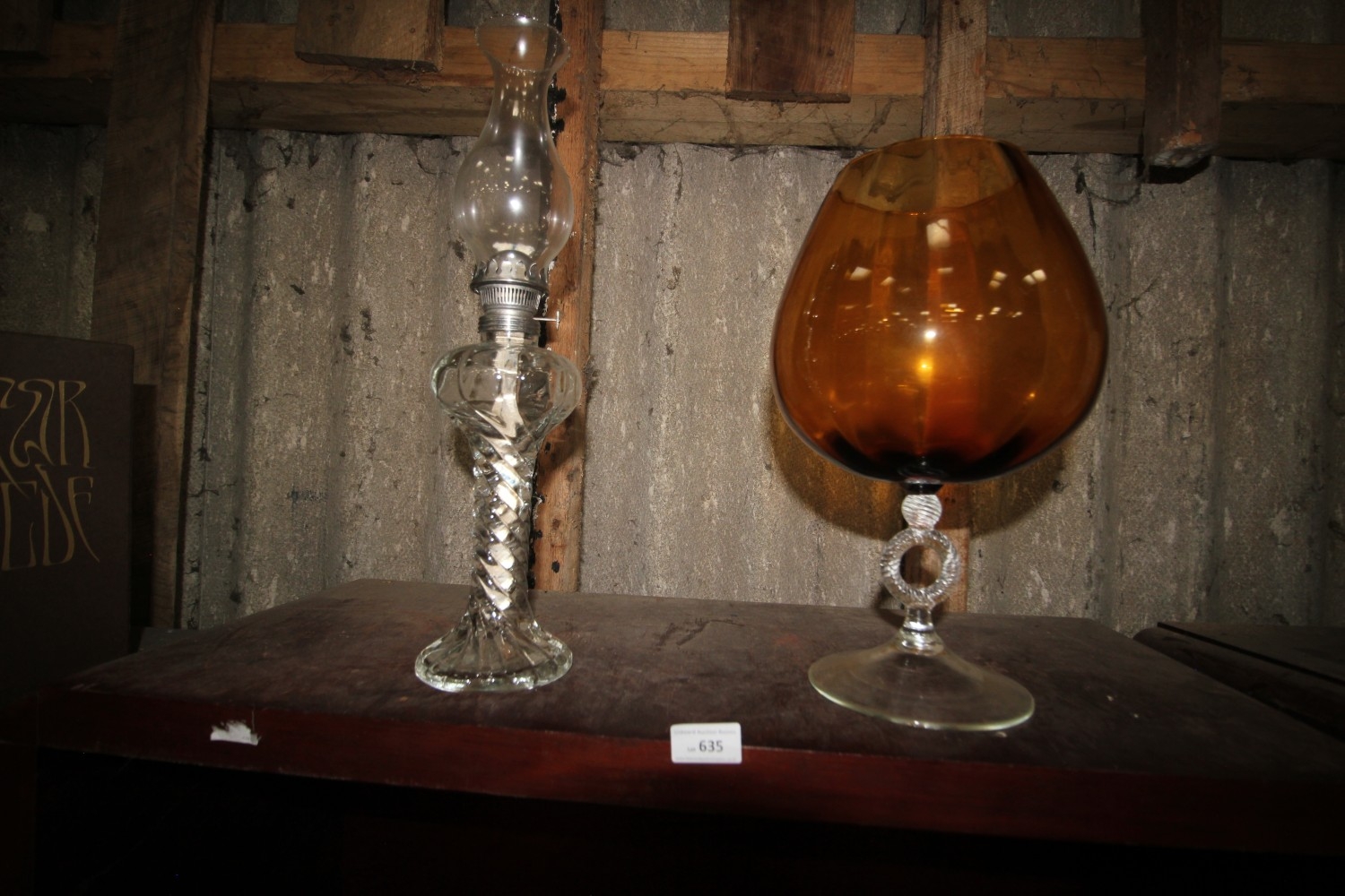extra large orange wine glass with inticate designs plus a glass tall standing oil lamp