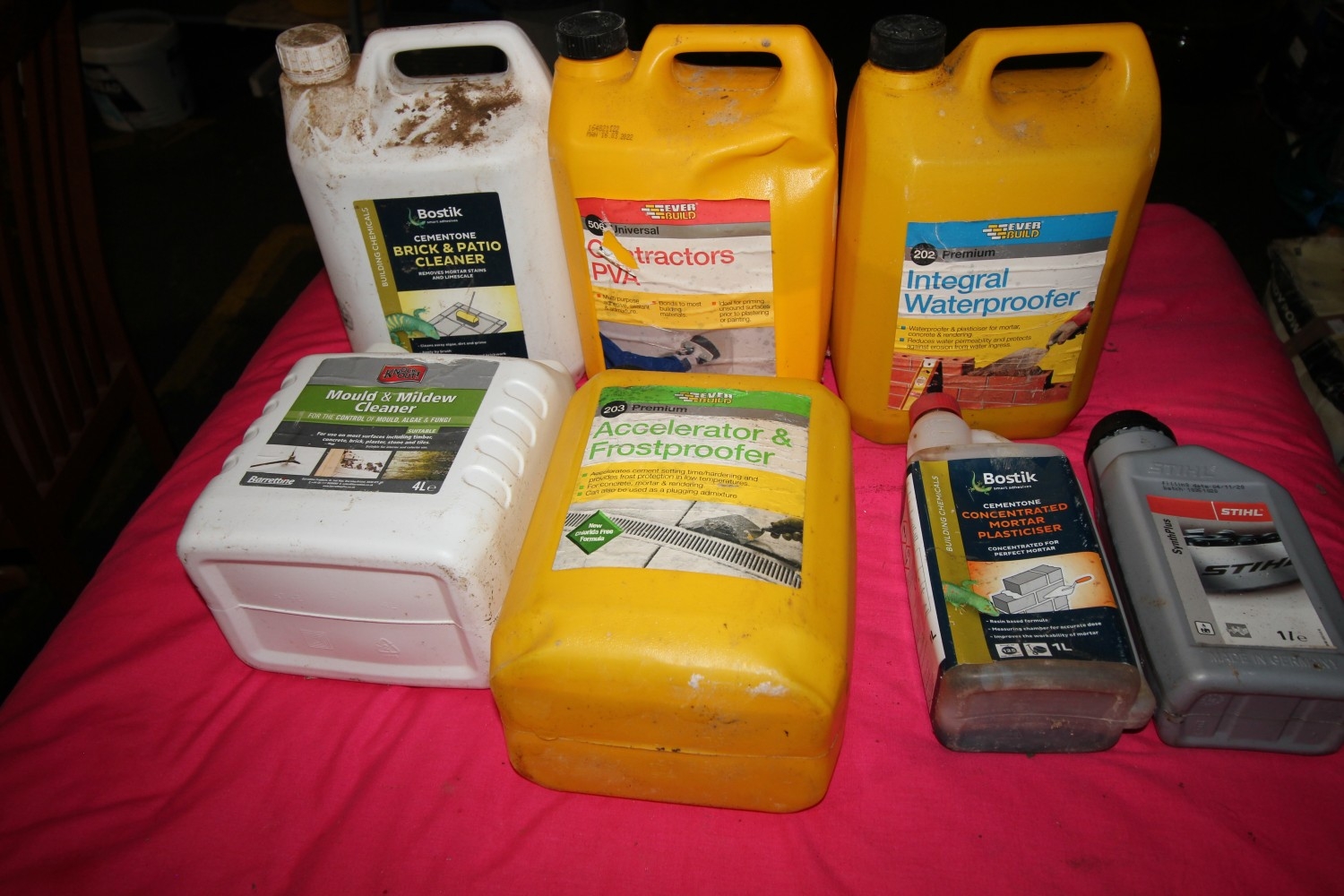 seven containers of building solutions inc integral waterproofer, brick cleaner, PVA, Accelerator and frostproofer, mould and mildew cleaner, plasticiser and chainsaw oil.