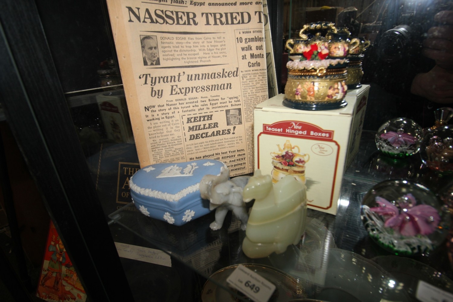 selection of polished stone / crystal camel and elephant plus wedgwood trinket dish, vintage 1956 newspaper etc