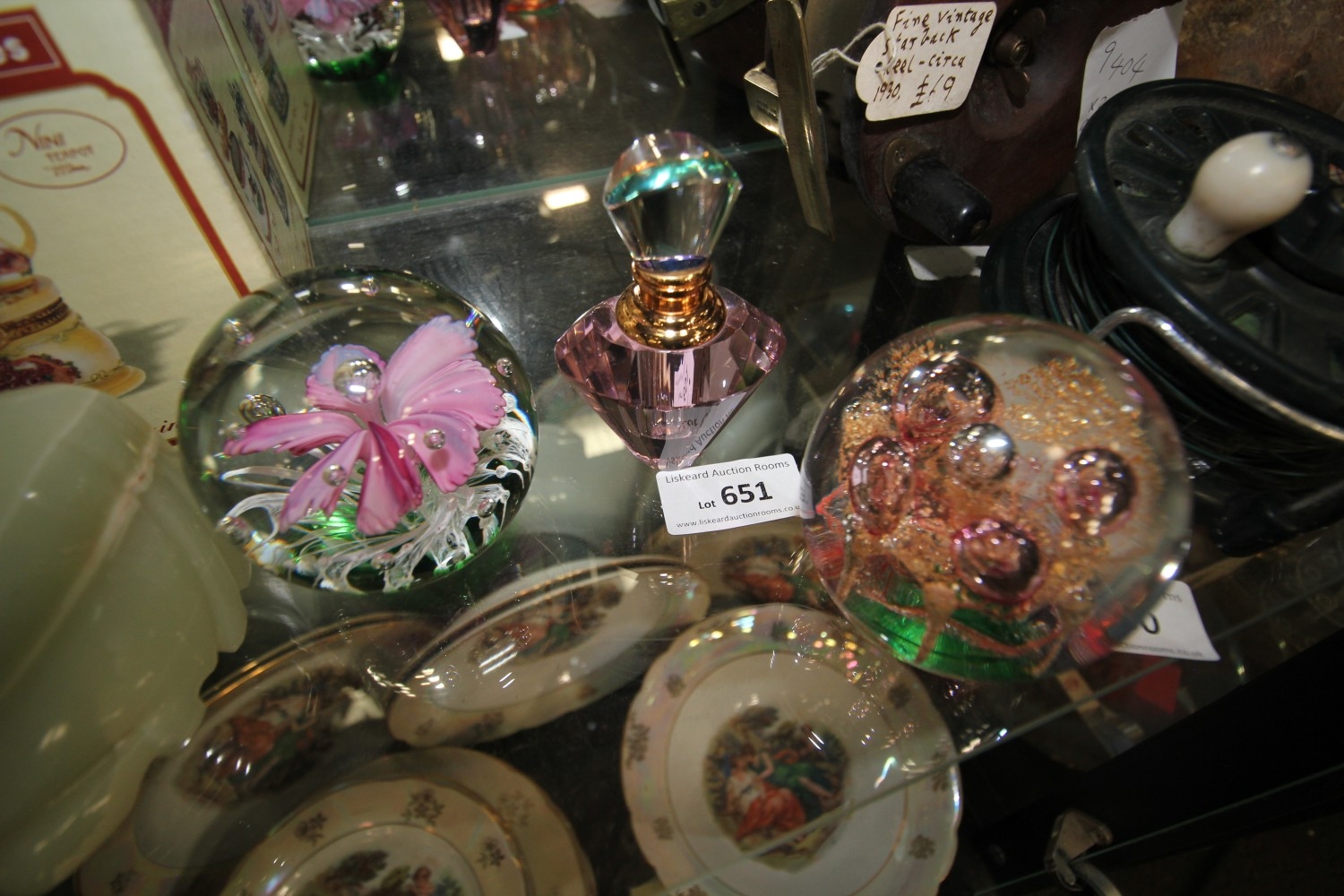 selection of 3 glass items inc 2 paperweights and vintage perfume bottle