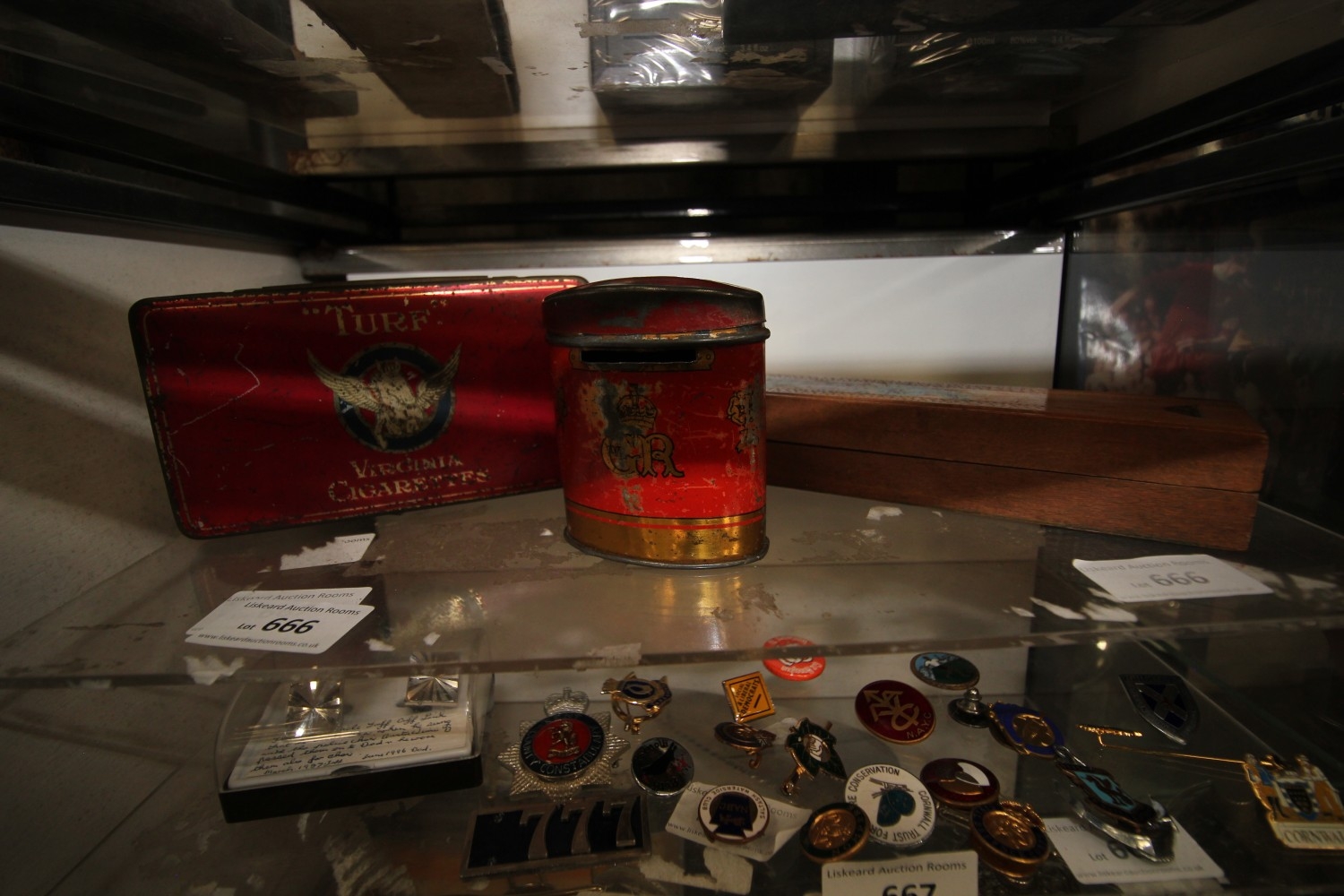 Lot 666: vintage wooden pencil case, plus 2 vintage tins