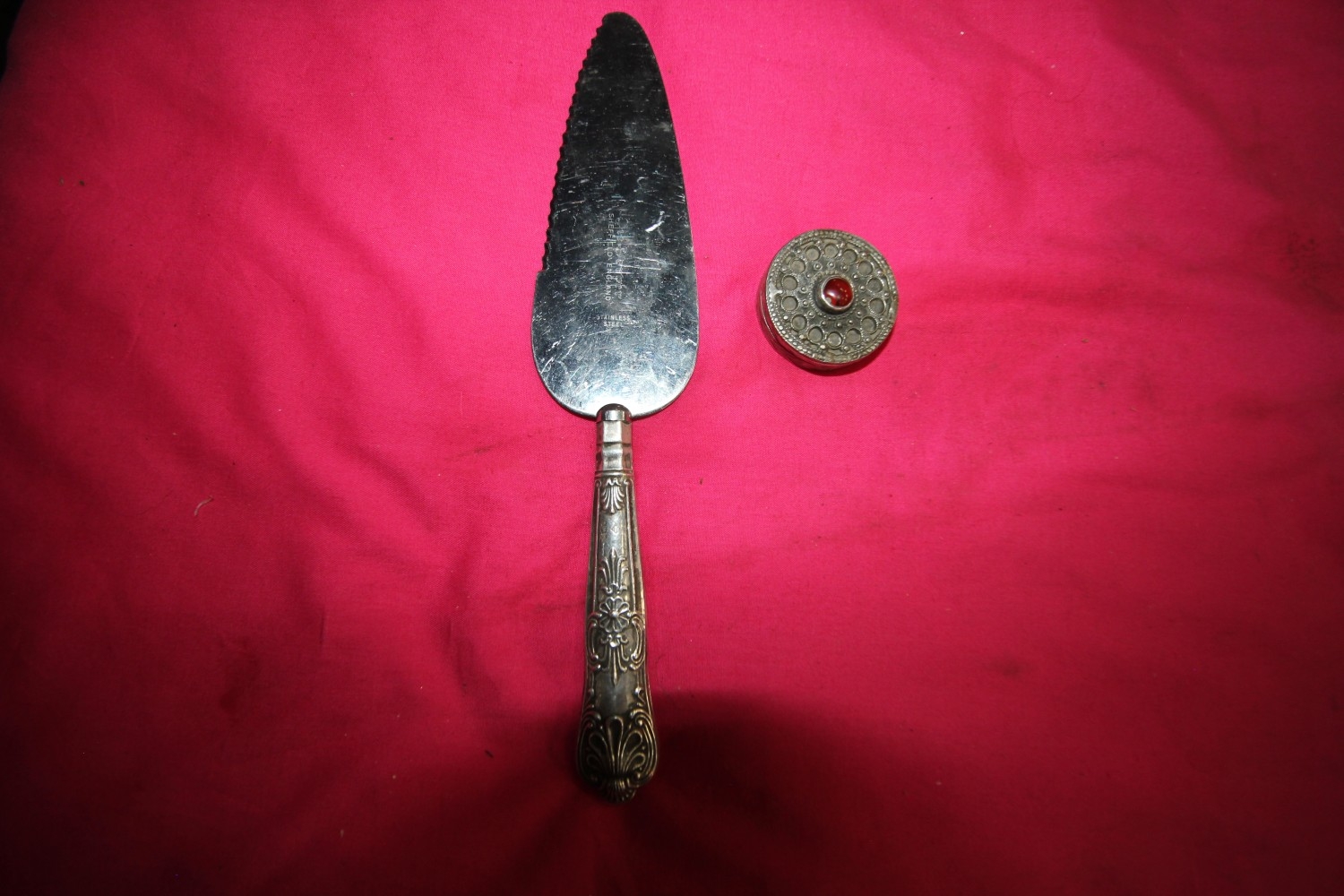 cake server utensil with hallmarked silver handle plus 1 trinket box silver stamped carnelian rub over set hinged trinket pot