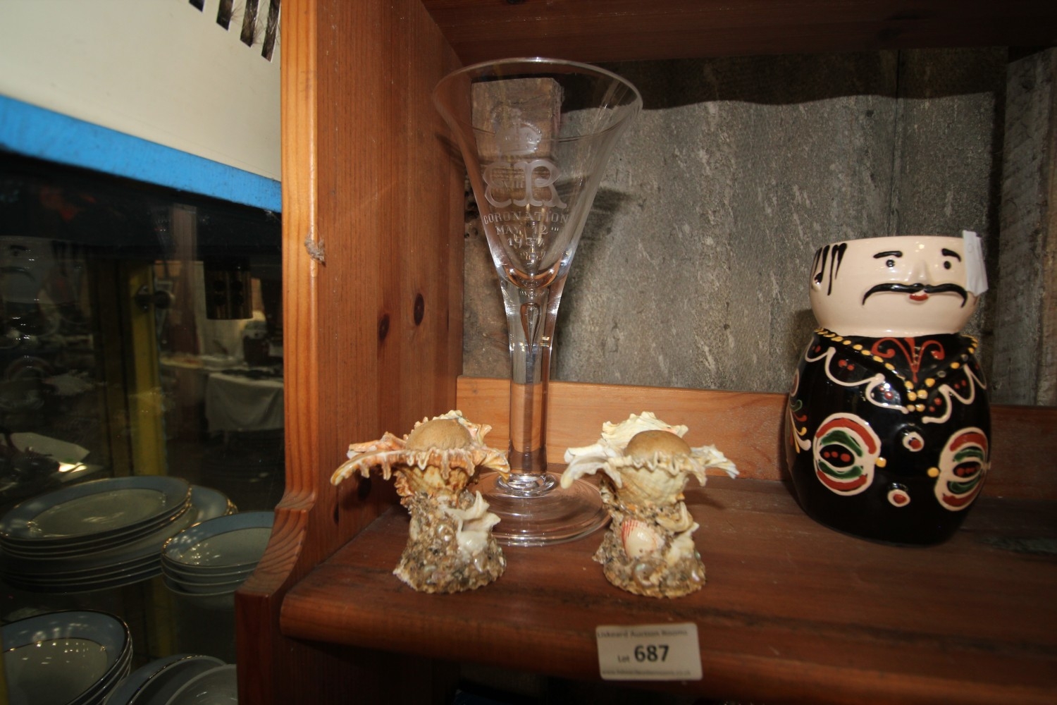 Lot 687: 2 shell decorative feature ornaments and glass vase