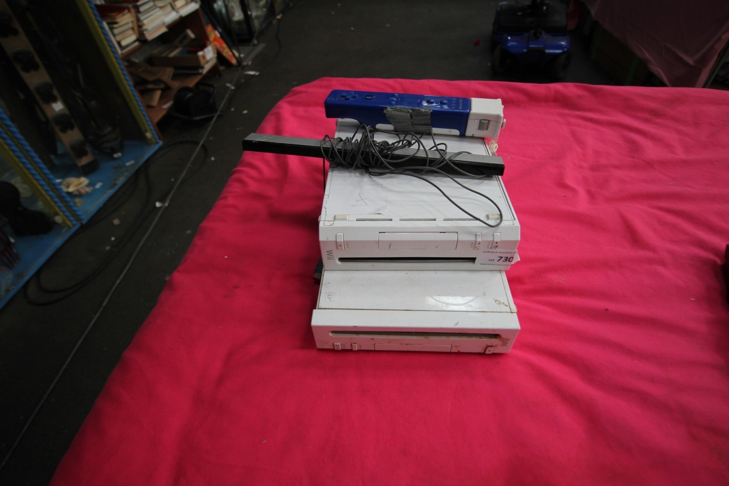 Lot 730: Two Wii consoles, light bar and wiimote controller...