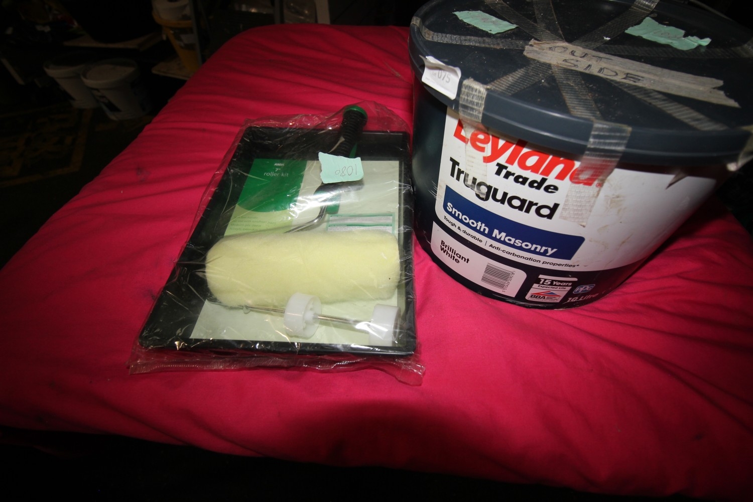 Full 10L tub of Leyland Trade Truguard Smooth masonry paint with new paint roller and tray set