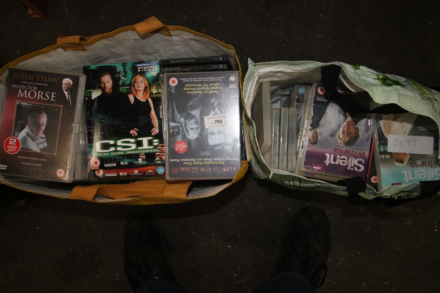 Two bags for life containing an inordinate amount of DVDs inc. Star Wars The Force Awakens, Inspector Morse boxed sets, Silent Witness boxed sets, Death in Paradise, Wire in the Blood, CSI and other boxed sets