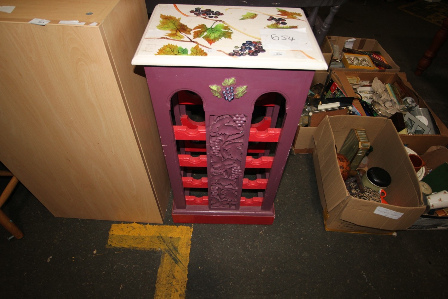 Lot 820: A WOODEN WINE RACK WITH A PURPLE AND...