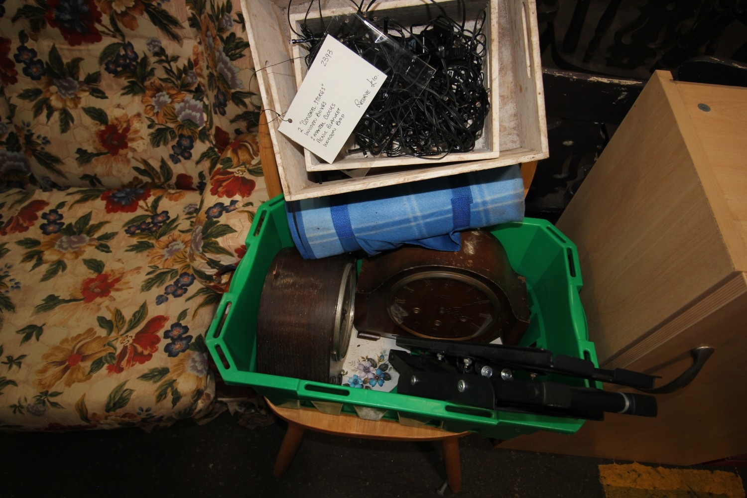 Two vintage mantle clocks, Smiths and one other, TV wall bracket, 2 x "General Stores" wooden boxes, picnic blanket, stout arch top stick back beech kitchen chair etc
