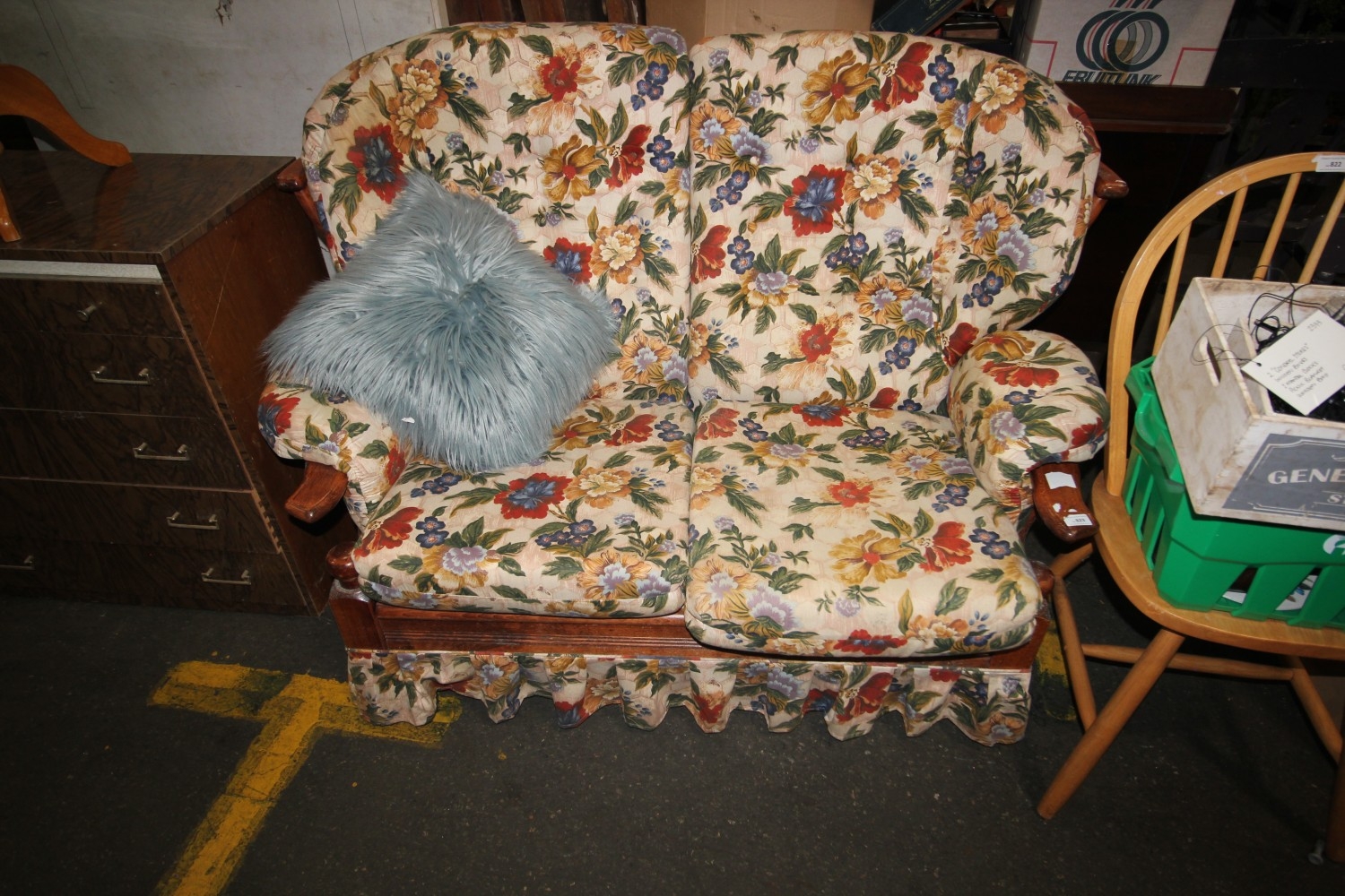 lovely solid wooden base 2 seater conservatory sofa with attractive floral pattern and cushions