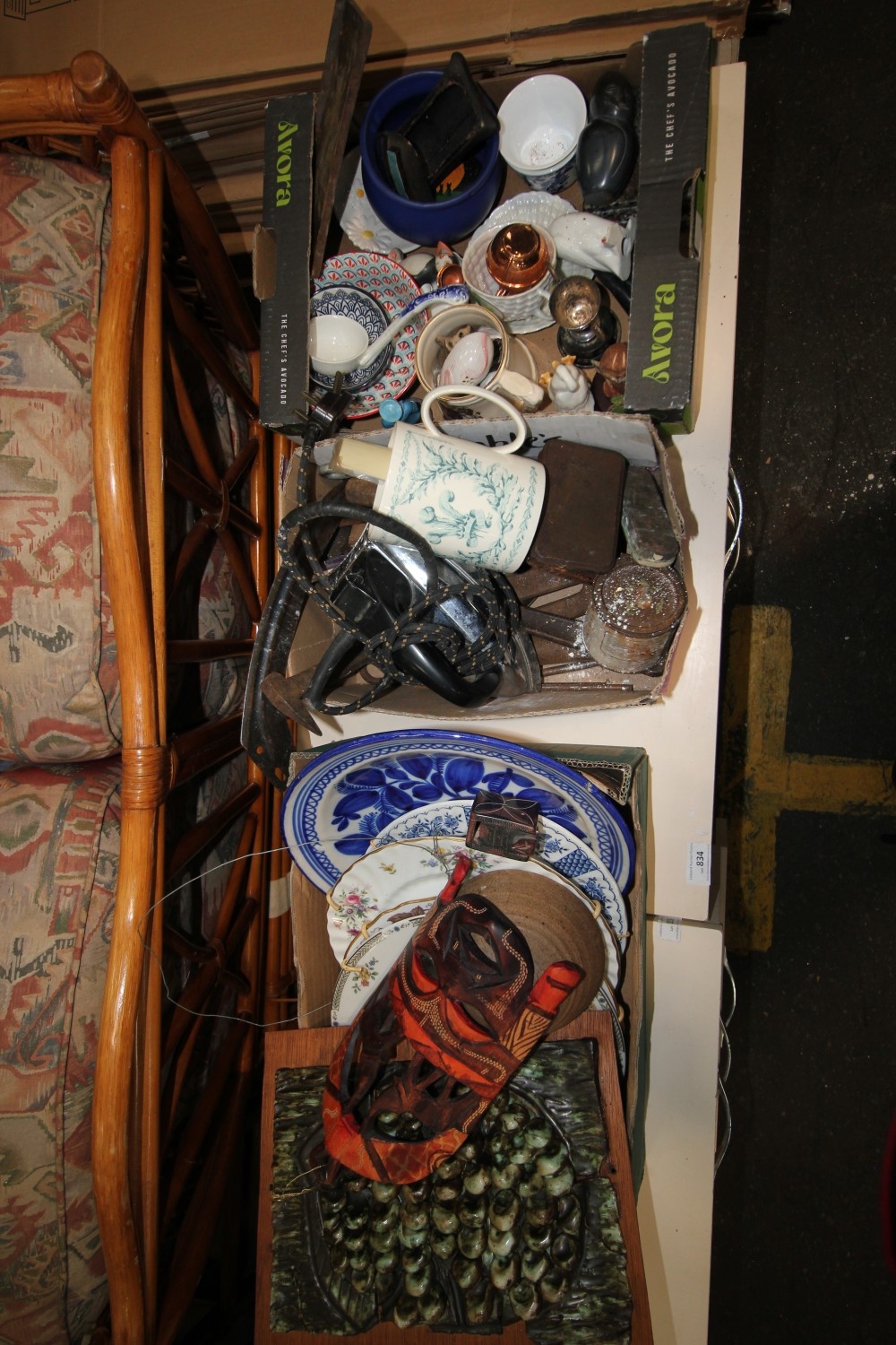 Three boxes of collectibles inc. handcrafted stylized ceramic fish, ethnic mask, vintage china plates, Stilsons and other tools, granite coasters and more