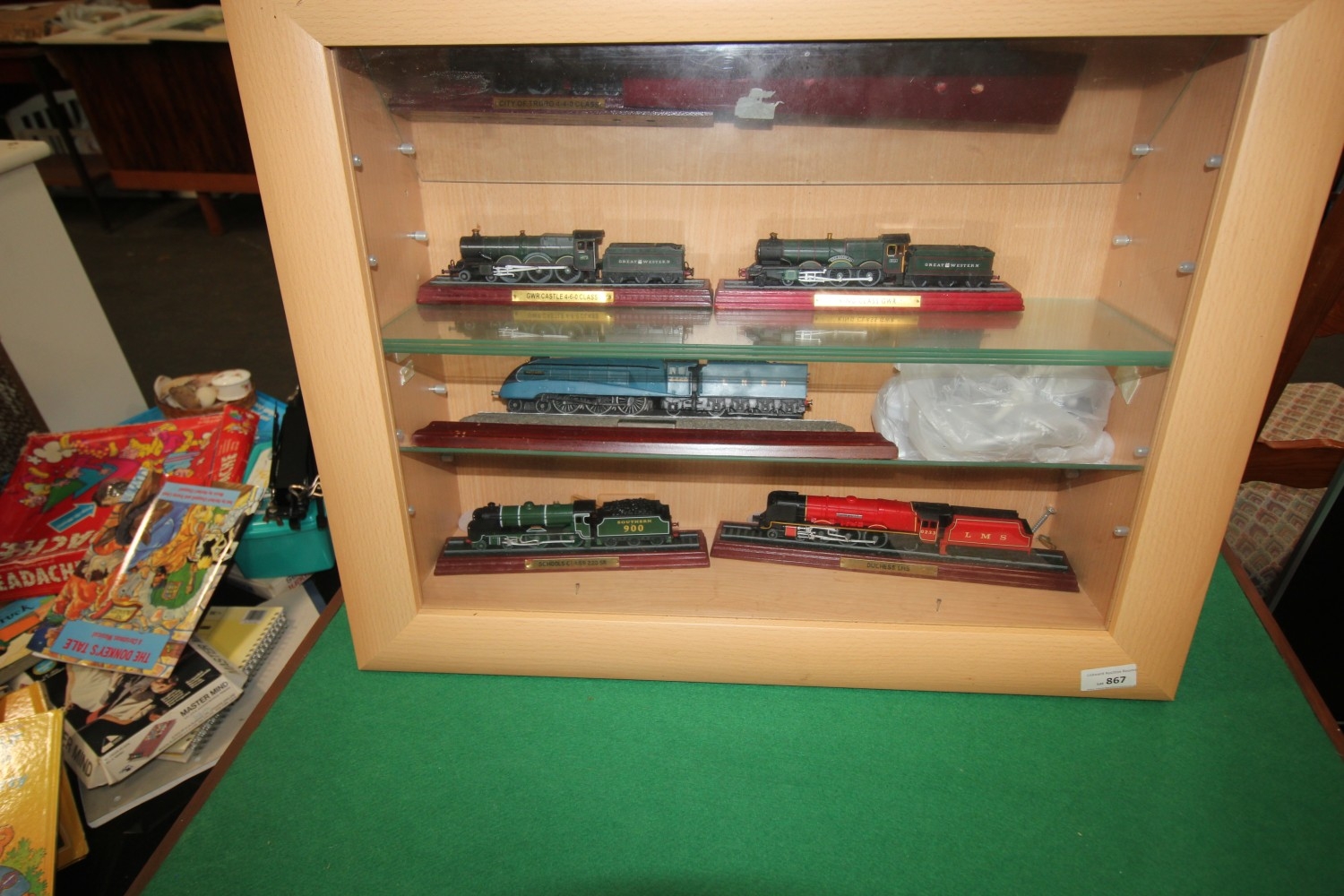 lovely wall cabinet with glass shelves inc model trains