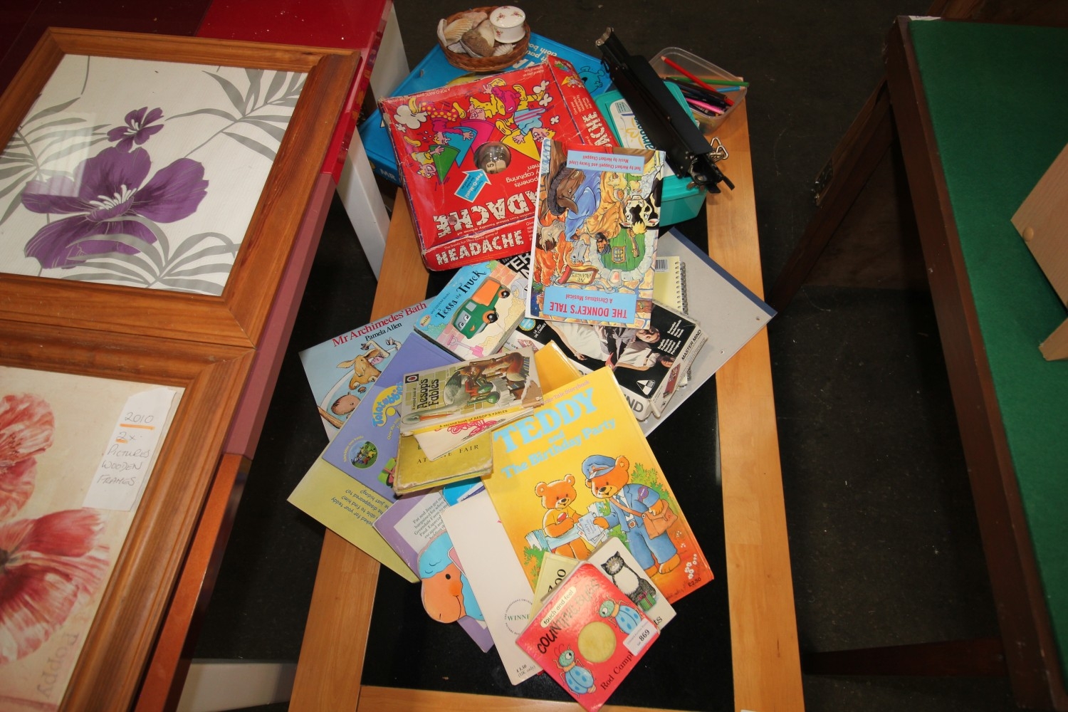 mixed selection of vintage kids books, games, colouring pencils etc