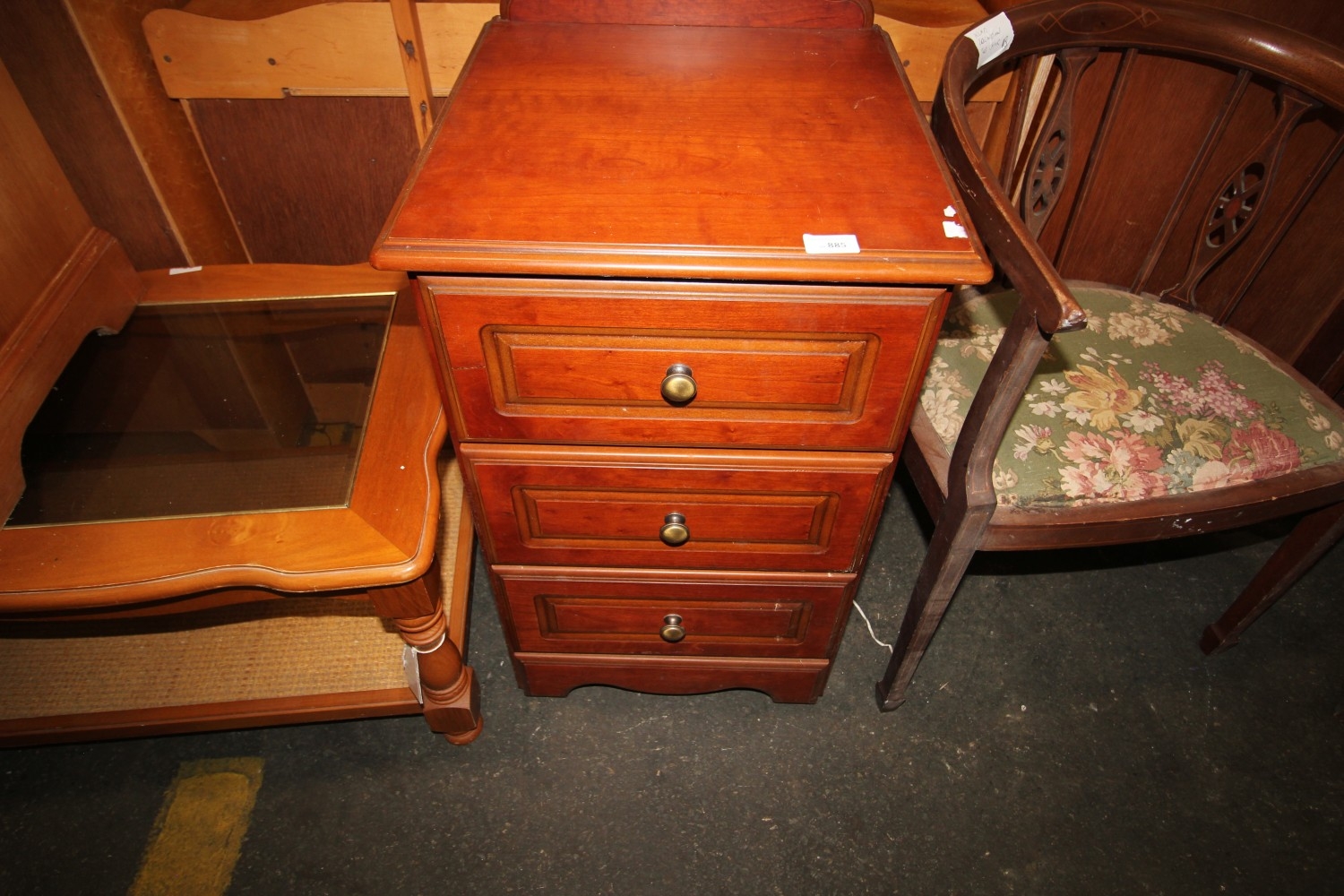 Lot 885: Vintage-styled modern three drawer bedside in good condition...