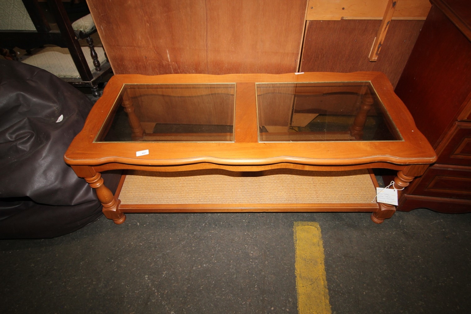 glass topped coffee table with wicker woven base shelf