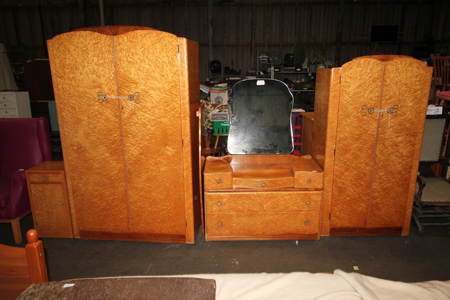 1950’s birds eye maple bedroom suite inc 2 lovely wardobes both diffrent sizes one is 165cm tall by 84cm wide and 50cm depth and the other is 190cm tall by 115 cm wide by 55cm depth also a lovley dressing table at 110 cm wide by roughtly 150 cm tall and 46cm depth and a lovley bedside cuboard 67cm tall 35cm wide and 30cm depth