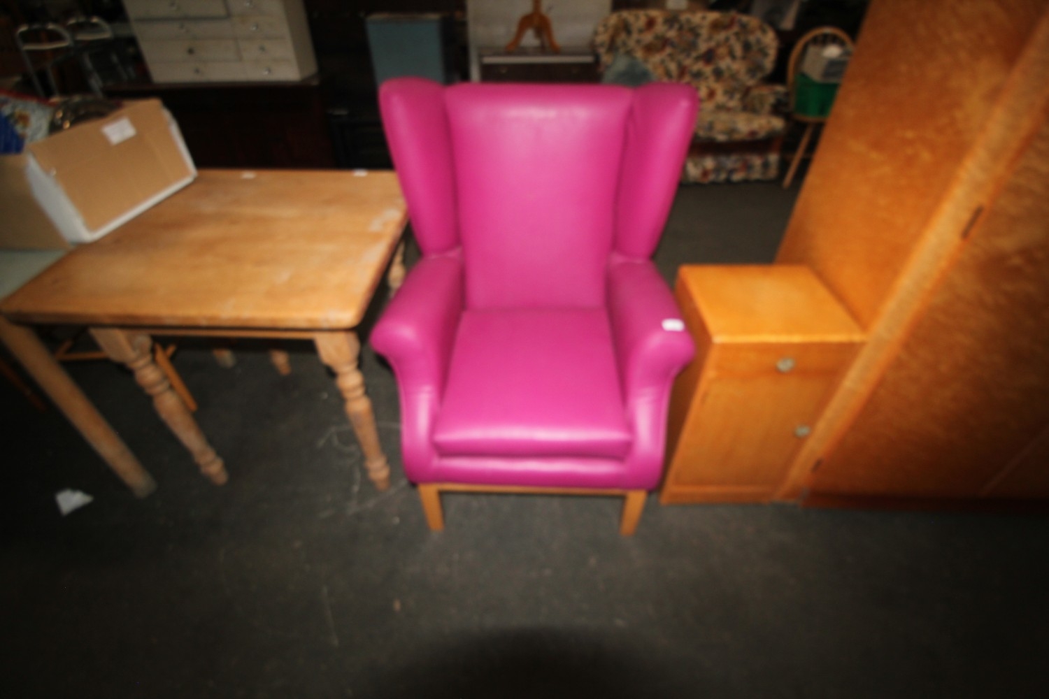 Lot 899: Vintage "Raspberry Crush" wingback high armed fireside chair...