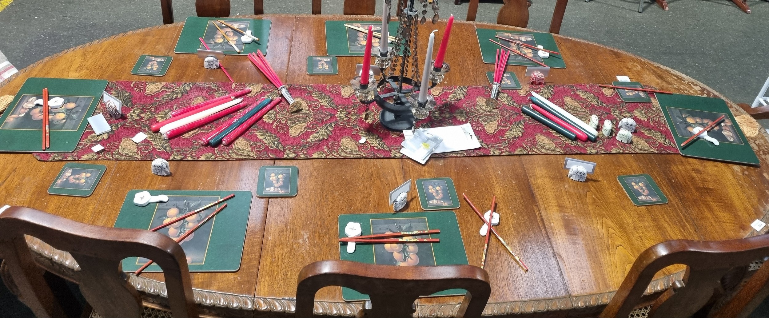 8 place setting accoutrements inc place-mats, coasters, table runner, candelabra, chopsticks with china stands, place name holders, spare candles etc