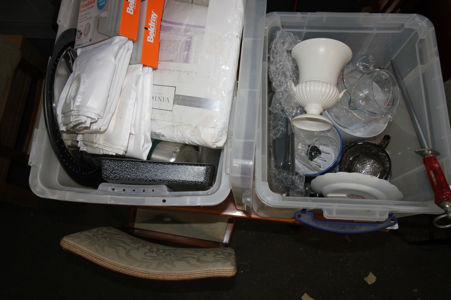 a large selection of items inc a dickoron knife sharpener wedgewood ceramics cooking tins ans pans new curtains and much much more