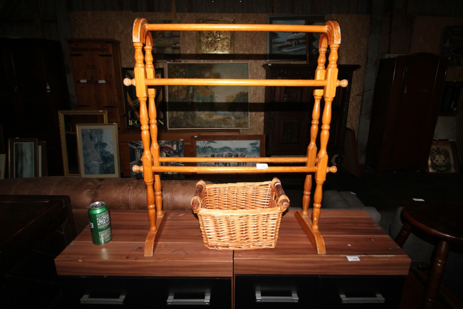 Vintage pine freestanding towel rail plus a wicker basket containing graduated swallows