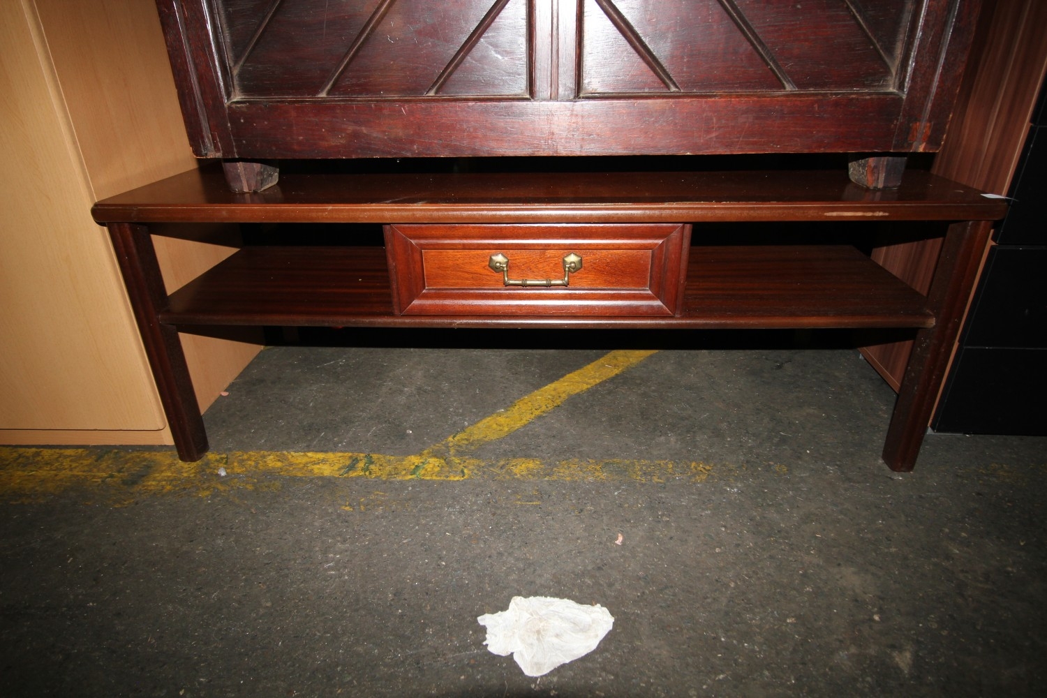 Single drawered mahogany coffee table measuring 122cm x 51cm x 43cm in height