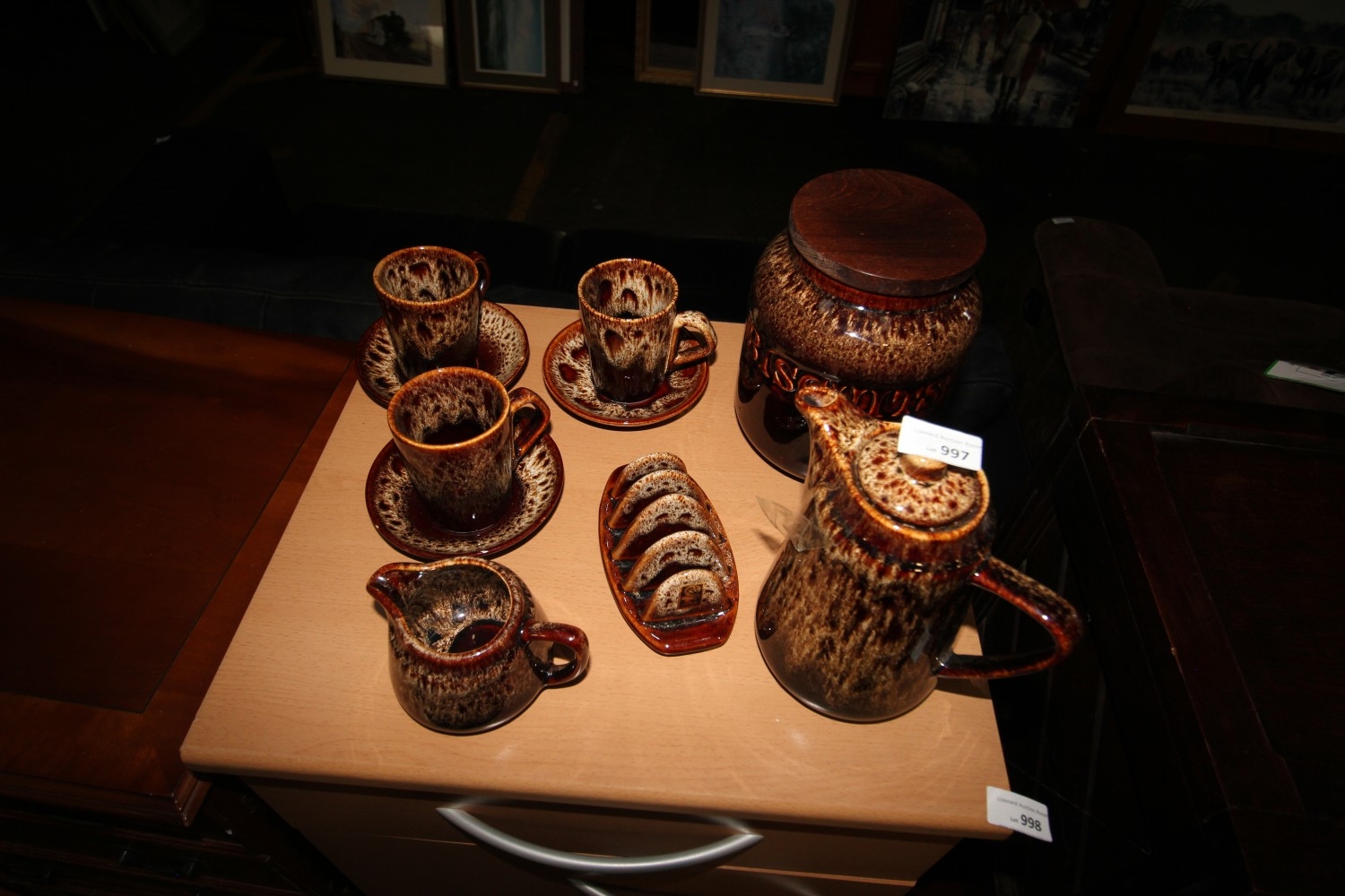 Vintage Fosters Cornish Pottery coffee set with honeycomb drip glaze consisting of lidded coffee pot, lidded biscuit barrel, creamer jug, toast rack and three cups and saucers
