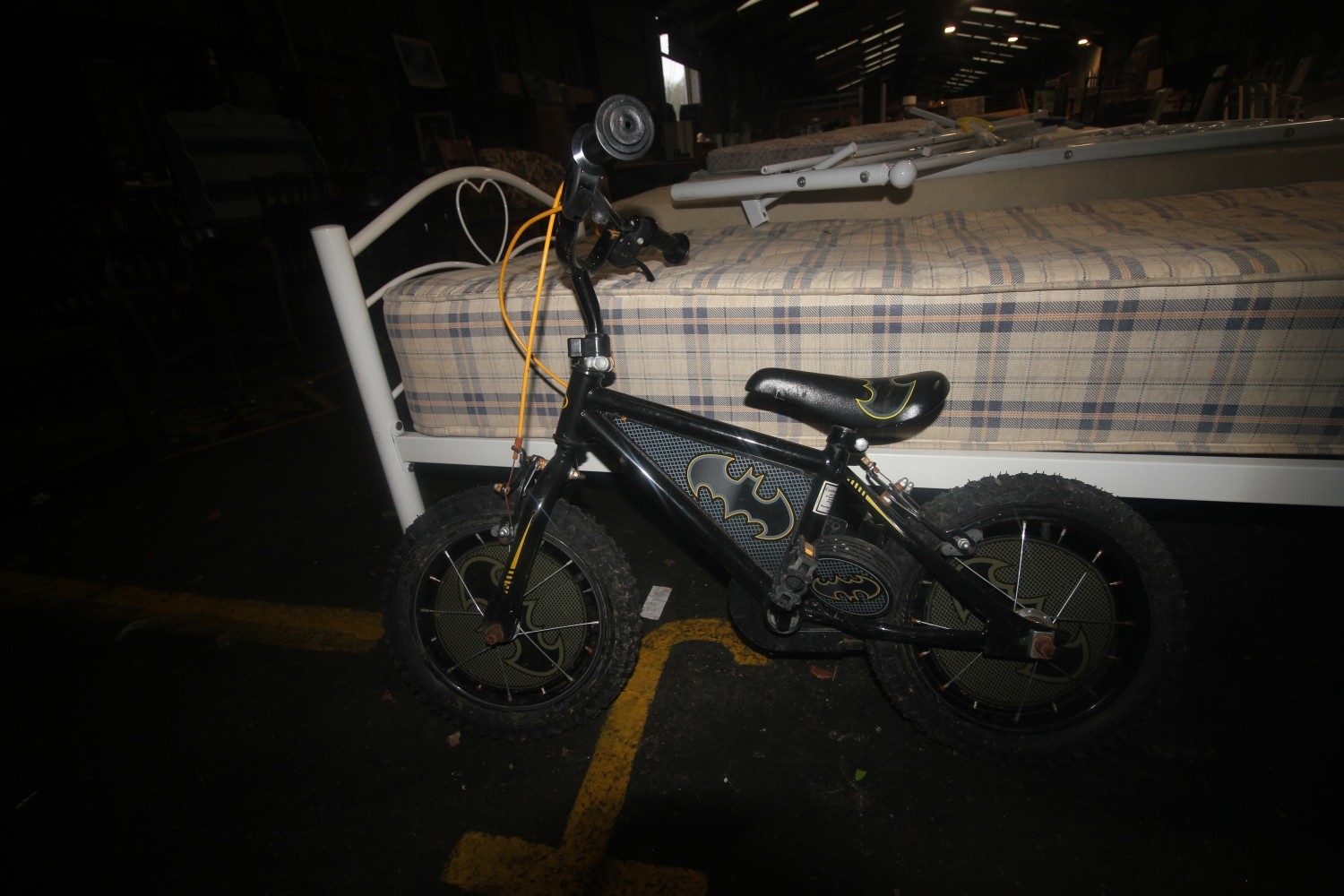 A child’s Batman BMX bike in good condition plus a brightly coloured balance bike