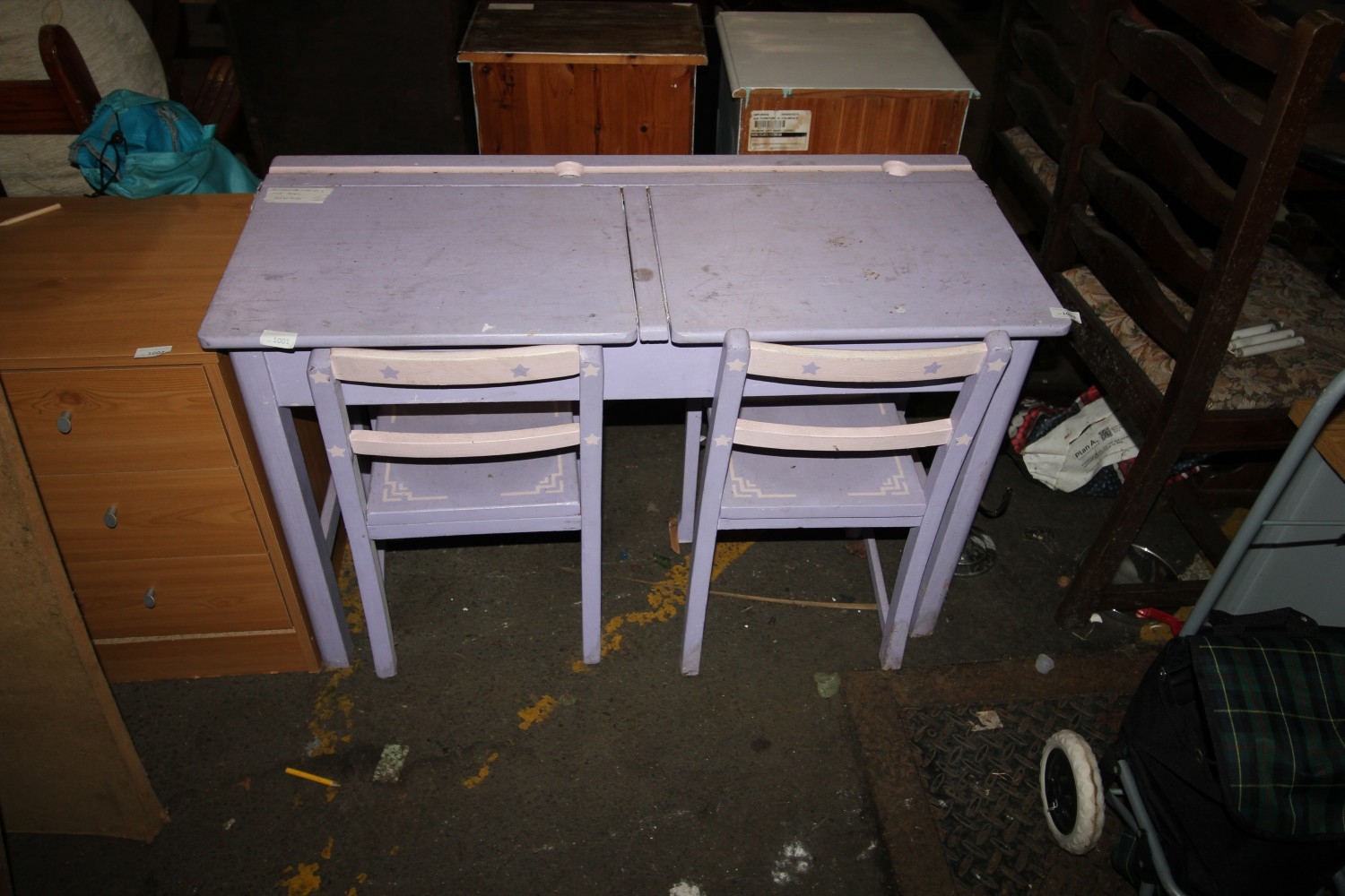 Lot 1001: Vintage compact lift-top school desk with matching chairs
