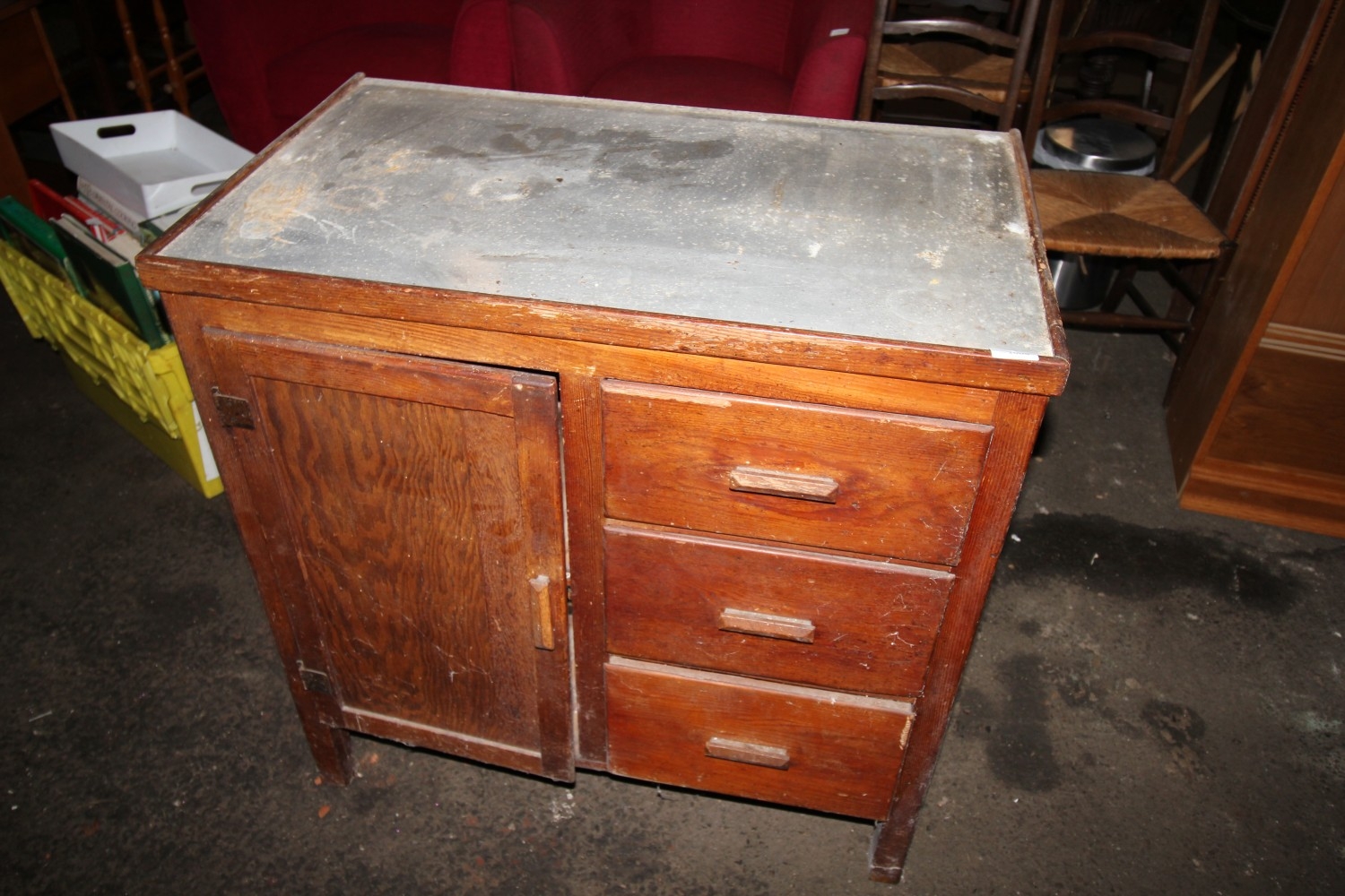 Lot 1008: Vintage pine dovetailed three drawer one door kitchen...