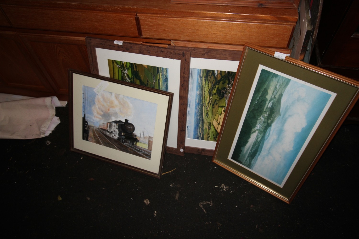 3 x framed aerial photo prints of the Cornish countryside, plus an original watercolour of a locomotive