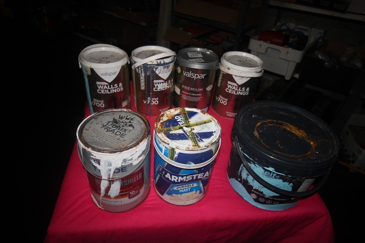 A full shelf of mixed paints – some full including Valspar 5L interior matt wall and ceiling paint etc.