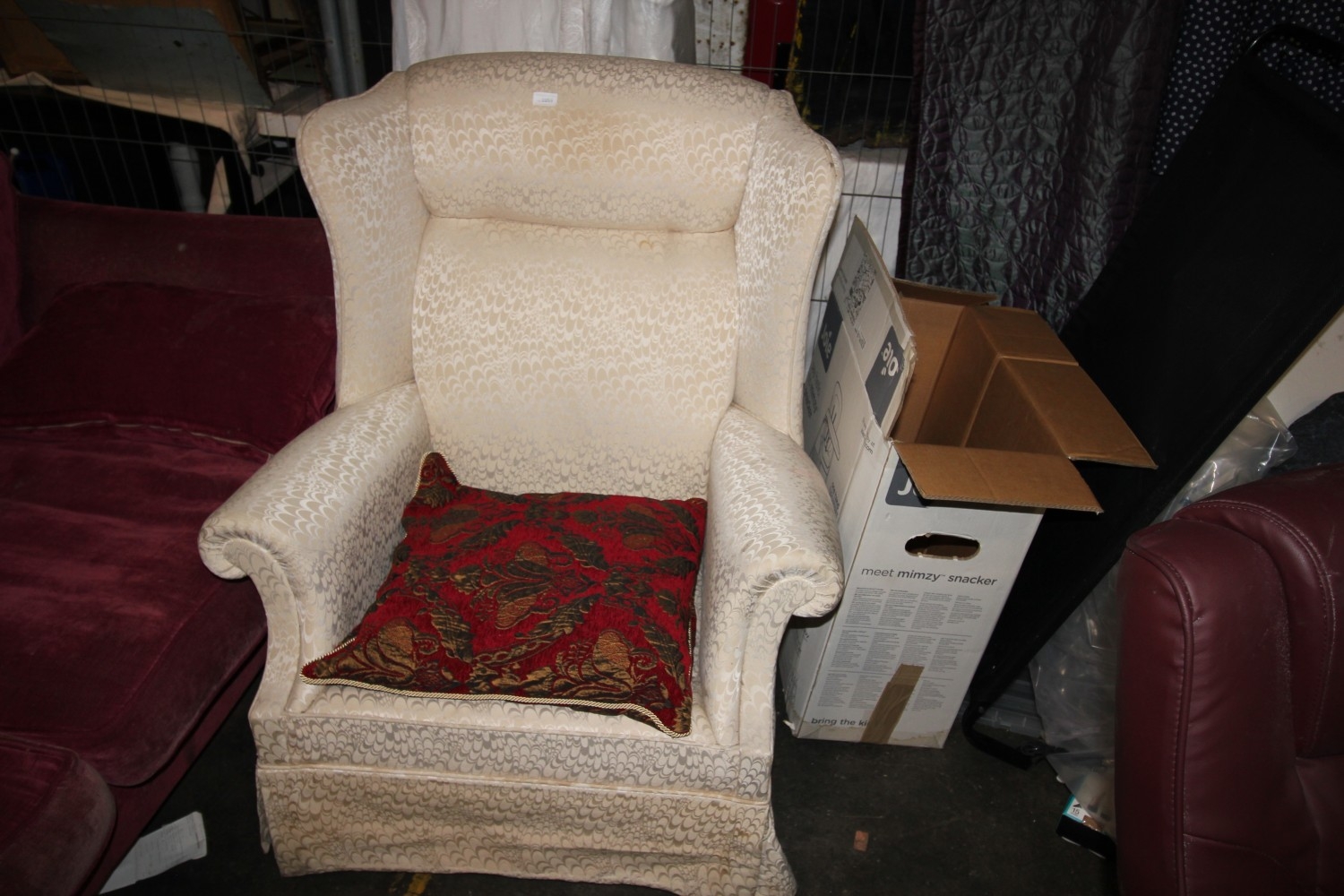Lot 1059: Cream peacock tail patterned wingback armchair