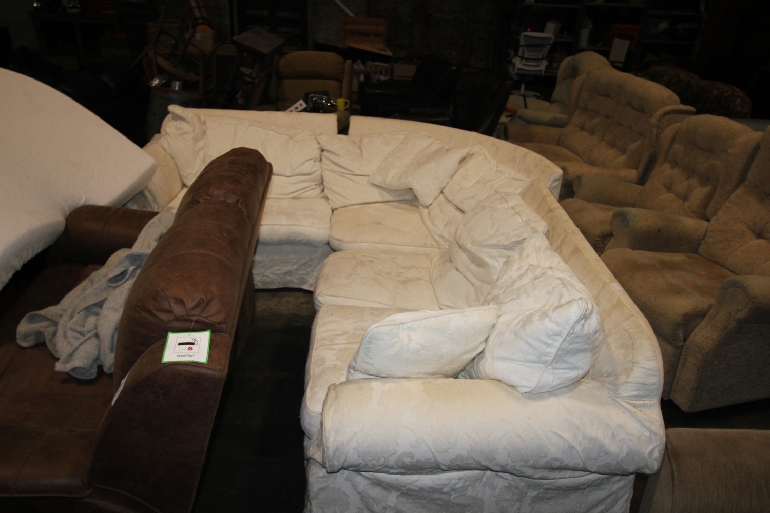 Lot 1062: Large white patterned corner sofa. In need of...