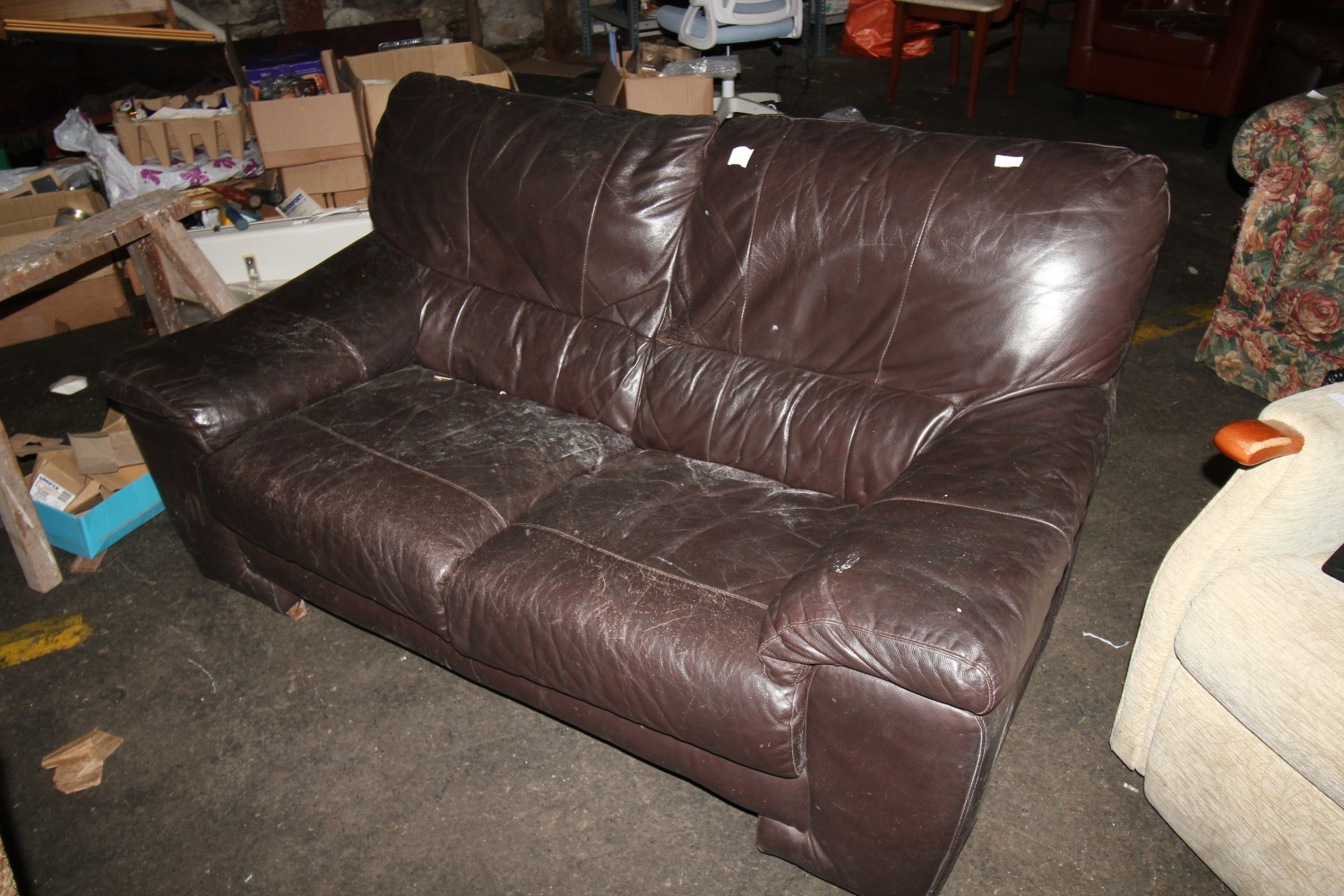 Lot 1065: Dark chocolate coloured two seater leather sofa