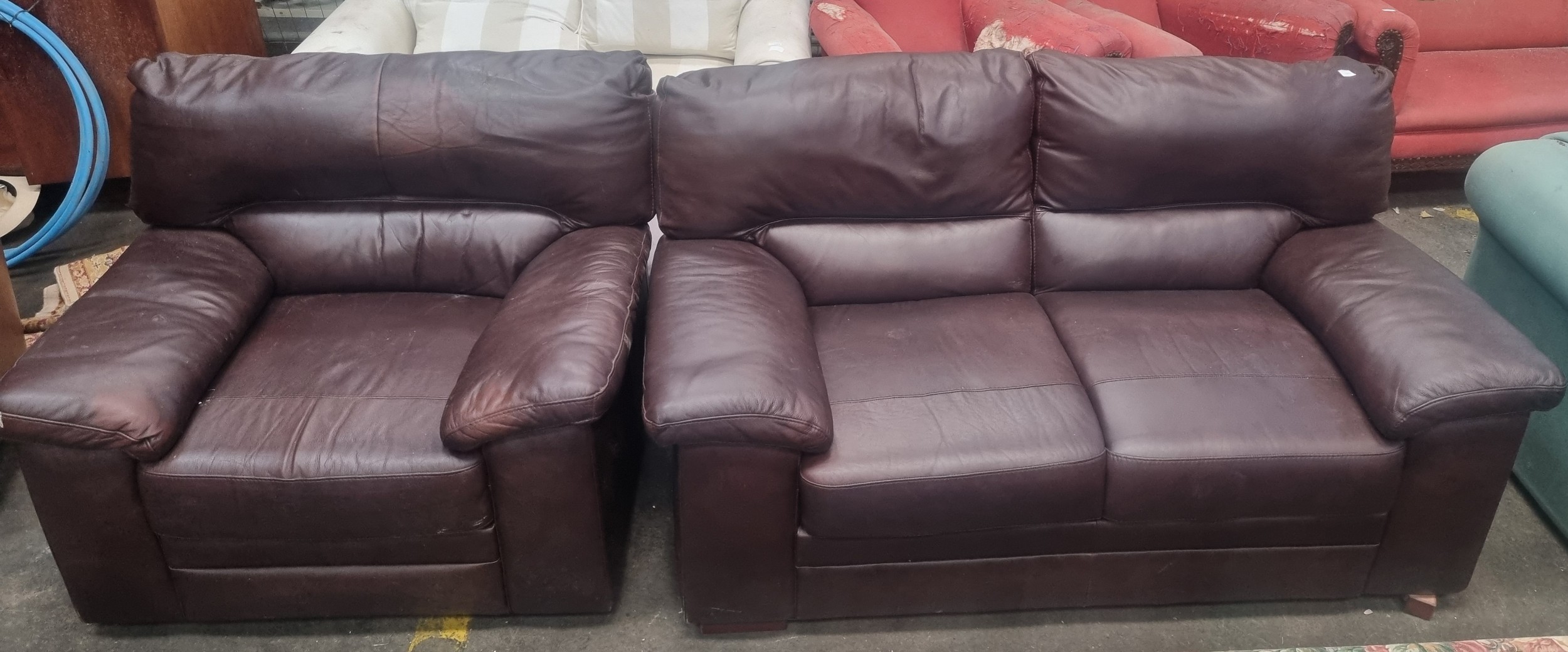 Lot 1079: Chocolate faux leather two seater sofa with matching...
