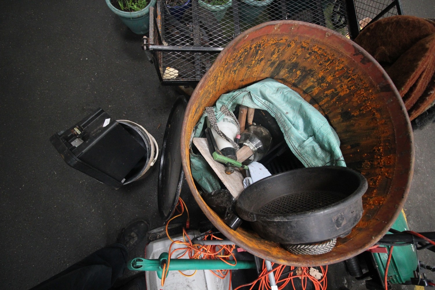 Large lidded steel drum and contents inc storage box, soil sieve, plant pots and more